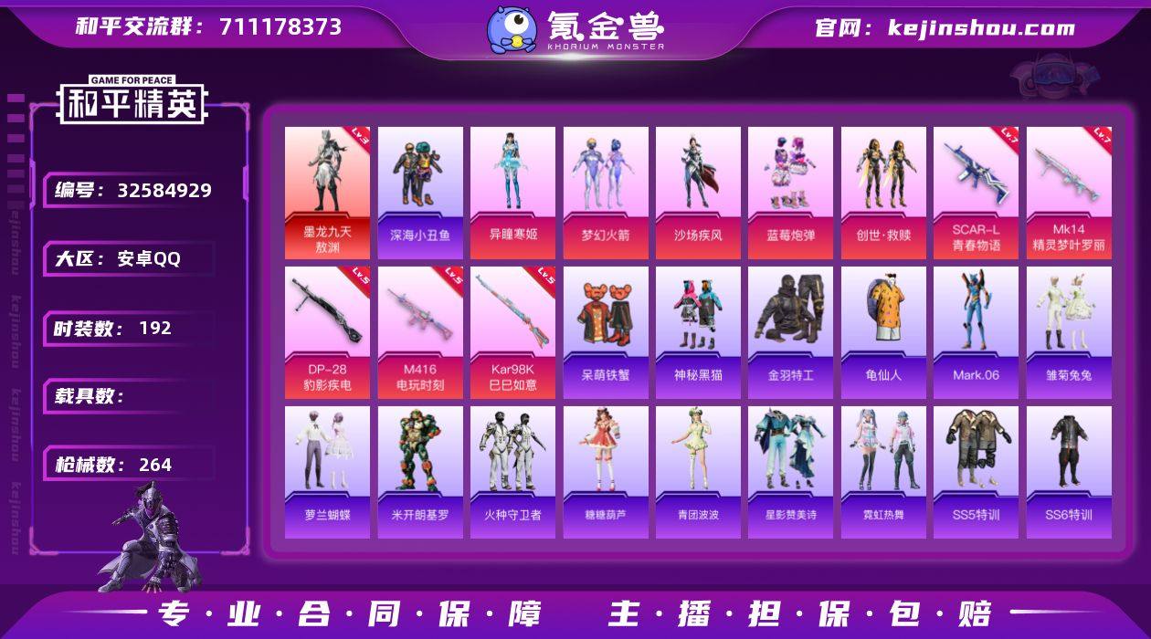 安卓 手Q-1神装-5粉装-7特效枪-0载具-3粉色飞行器-81477热力值-17王牌印记-192套装-264枪皮【红色神装等级】:墨龙九天-敖渊(三级)【红色角色神装】:墨龙九天-敖渊【热门品类】:粉装-梦幻火箭,套装-深海小丑鱼,套装-金羽特工,套装-龟仙人,角色-Mark.06【粉色套装】:粉装-梦幻火箭,粉装-沙场疾风,粉装-蓝莓炮弹,套装-创世·救赎,角色-异瞳寒姬【粉色枪皮等级】:SCAR-L-青春物语(七级),M416-电玩时刻(五级),ACE32-萌骑漫游(二级),Kar98K-巳巳如意(五级),Mk14-精灵梦叶罗丽(七级),Mk14-福马献瑞(五级),DP-28-豹影疾电(五级)【粉色枪皮】:SCAR-L-青春物语,M416-电玩时刻,ACE32-萌骑漫游,Kar98K-巳巳如意,Mk14-精灵梦叶罗丽,Mk14-福马献瑞,DP-28-豹影疾电【粉色飞行器】:炫彩糖果飞行器,梦幻火箭飞行器【粉色降落伞】:快乐主宰降落伞,至尊龙雀降落伞,梦幻火箭降落伞,激战未来降落伞,香水柠檬降落伞,王牌四分卫降落伞,星之彼岸降落伞,怪笑疯兔降落伞,海渊国主降落伞,精灵梦叶罗丽降落伞,初号机 觉醒Ver.降落伞,鬼刀降落伞,异瞳寒姬降落伞,极意拳锋降落伞,炫彩糖果降落伞【稀有套装】:套装-龟仙人,套装-雪国风尚,套装-炫彩糖果,套装-马...