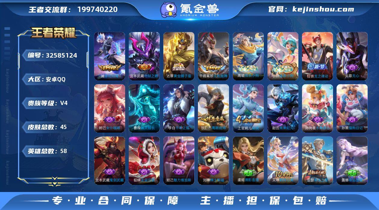 安卓Q-V4-最强王者段位-58英雄-45皮肤-5传说-15史诗【传说皮肤】:马超神骥逐星野,澜逐花归海,干将莫邪久胜战神,达摩黄金狮子座,宫本武藏地狱之眼【限定皮肤】:狄仁杰阴阳师,元歌无心,项羽海滩派对,上官婉儿梁祝,沈梦溪龙舞盛年【赛季限定】:亚瑟荣光之誓【战令限定】:周瑜线条小狗,小乔线条小狗【史诗皮肤】:周瑜线条小狗,小乔线条小狗,狂铁龙之律动,元歌无心,上官婉儿梁祝,狄仁杰鹰眼统帅,孙策猫狗日记,李白千年之狐,曹操幽灵船长,刘禅绅士熊喵,妲己女仆咖啡,妲己魅力维加斯,孙尚香水果甜心,宫本武藏鬼剑武藏,貂蝉圣诞恋歌,赵云未来纪元【其他皮肤】:虞姬溯影追猎,艾琳鹤鸣心笺,亚瑟荣光之誓,哪吒罗小黑战记,露娜命运加冕,沈梦溪龙舞盛年,戈娅危途狂花,王昭君幻想奇妙夜,刘备汉昭烈帝,狄仁杰阴阳师,花木兰兔女郎,亚瑟死亡骑士,宫本武藏未来纪元,赵云忍炎影,露娜哥特玫瑰,项羽海滩派对,桑启画中游,马超幸存者,曜归虚梦演,李信灼热之刃,杨玉环霓裳曲,铠龙域领主,杨戬埃及法老,后羿精灵王【营地ID】:1577597768