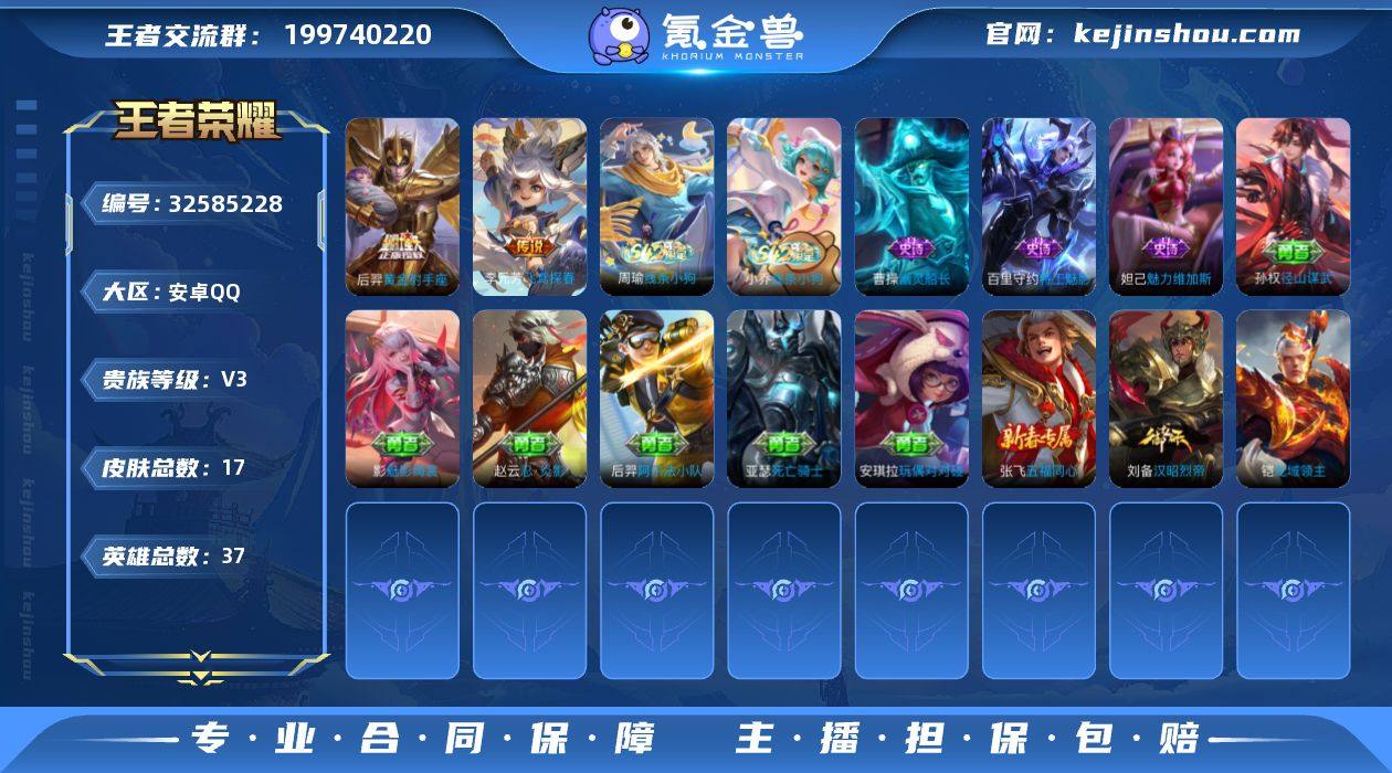 安卓Q-V3-最强王者段位-37英雄-17皮肤-3传说-4史诗【英雄全皮】:孙权全皮【传说皮肤】:狄仁杰神骥赴朔漠,李元芳飞鸢探春,后羿黄金射手座【战令限定】:周瑜线条小狗,小乔线条小狗【史诗皮肤】:周瑜线条小狗,小乔线条小狗,百里守约特工魅影,曹操幽灵船长,妲己魅力维加斯【其他皮肤】:孙权径山谋武,影魅影绮裳,刘备汉昭烈帝,后羿阿尔法小队,张飞五福同心,亚瑟死亡骑士,安琪拉玩偶对对碰,赵云忍炎影,铠龙域领主【营地ID】:1624694927