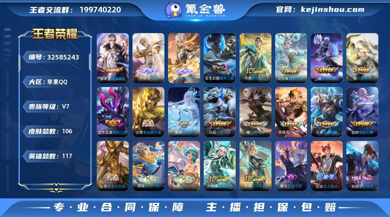 苹果Q-V7-最强王者段位-117英雄-106皮肤-1典藏皮肤-3无双-15传说-29史诗【英雄全皮】:孙权全皮【荣耀典藏】:诸葛亮星域神启【无双皮肤】:李信问心剑,孙悟空无相,曜器灵螭龙剑【传说皮肤】:韩信踏浪归,云缨神骥越千峰,杨戬纵目迁山,公孙离云诺千山,裴擒虎祥瑞亨通,澜逐花归海,露娜霜月吟,吕布怒海麟威,马超无双飞将,镜炽阳神光,曜云鹰飞将,貂蝉猫影幻舞,张良黄金白羊座,达摩黄金狮子座,宫本武藏地狱之眼【限定皮肤】:暃埋骨钱,姜子牙天穹之誓,狄仁杰阴阳师,赵云皇家上将,孙尚香蔷薇恋人,狄仁杰魔术师,项羽海滩派对,孙悟空至尊宝,百里玄策原初追逐者,高渐离燃音魔法,刘邦剑破天穹,程咬金群星魔术团【赛季限定】:刘邦剑破天穹,姜子牙天穹之誓,钟馗虚灵犬护,甄姬逆浪荇歌,亚瑟荣光之誓,百里玄策原初追逐者【战令限定】:高渐离燃音魔法,周瑜线条小狗,小乔线条小狗【史诗皮肤】:周瑜线条小狗,小乔线条小狗,少司缘巫礼祀神,女娲万灵启世,黄忠百相守梦,狂铁龙之律动,暃埋骨钱,高渐离燃音魔法,司马懿暗渊魔法,百里玄策原初追逐者,狄仁杰鹰眼统帅,孙策猫狗日记,阿轲节奏热浪,程咬金功夫厨神,铠曙光守护者,雅典娜冰冠公主,诸...