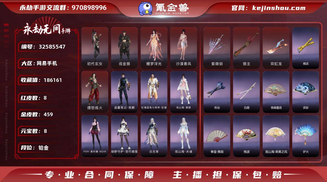 0AHY66网易手机8个红皮,戎金狼(特木尔),熛怒炼火(季沧海),初代玄女(宁红夜),鲤梦浮光(胡桃),沙漠香风(迦南),双虹龙(双刀),狼主(阔刀),紫微剑(长剑)