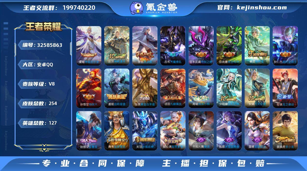 【Bwz590】【精品小号-八千战澜/市标韩信】安卓Q区-V8-127英雄-254皮肤-1典藏皮肤-10传说-59史诗(凤求凰、冰锋战神、至尊宝、狮心王、纯白花嫁) 【英雄全皮】:孙权全皮 【荣耀典藏】:虞姬神鉴启示录 【传说皮肤】:后羿神树通天,桑启鸣野蒿,虞姬启明星使,张良黄金白羊座,李白凤求凰,孙尚香末日机甲,宫本武藏地狱之眼,孙悟空地狱火,吕布天魔缭乱,狄仁杰超时空战士 【限定皮肤】:白起狰,姜子牙天穹之誓,狄仁杰阴阳师,小乔纯白花嫁,虞姬凯尔特女王,赵云皇家上将,墨子神迹守卫,孙尚香蔷薇恋人,鲁班七号狮舞东方,庄周蜃楼王,庄周高山流水,高渐离死亡摇滚,孙膑妖精王,扁鹊炼金王,芈月重明,吕布天魔缭乱,吕布猎兽之王,周瑜真爱至上,夏侯惇朔风刀,曹操烛龙,典韦穷奇,典韦蓝屏警告,狄仁杰魔术师,狄仁杰万华元夜,达摩沙漠行僧,项羽海滩派对,老夫子醍醐杖,老夫子航海奇遇记,关羽冰锋战神,貂蝉逐梦之音,程咬金演武夺筹,兰陵王金庭之子,亚瑟狮心王,孙悟空至尊宝,牛魔御旌,李元芳银河之约,李元芳云中旅人,虞姬启明星使,钟馗神迹守卫,钟馗驱傩正仪,杨玉环遇见飞天,女娲朔望之晖,雅典娜黎明之约,蔡文姬繁星吟游,太乙真人饕餮,鬼谷...