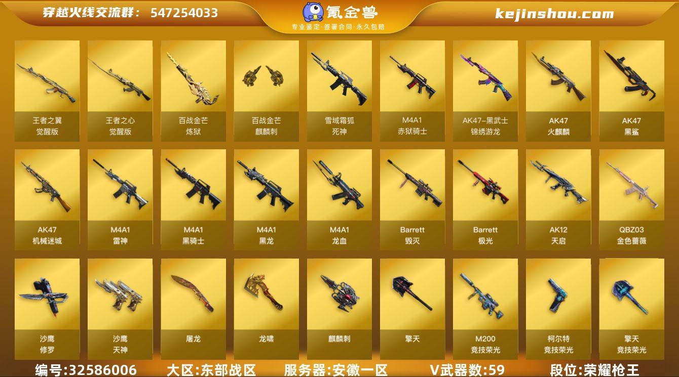 【ky3695】安徽一区-61V-5王者-0炫金 【热门武器】:QBZ03-金色蔷薇,M200-竞技荣光,M4A1-黑骑士,USP-雷暴,沙鹰-修罗*2 【王者炫金武器】:悦蓝-惊涛骇浪 【音效卡】:炼狱-百战金芒-庆典舞曲音效卡,死神-雪域霜狐-怀旧音效卡 【皮肤】:雷神-星空,雷神-诺拉 皮肤,M4A1-再燃火线,毁灭-英雄计划 皮肤,黑龙-能量核心,黑骑士-伏羲,修罗-百战金芒 皮肤,轻型军用手斧-再燃火线 【角色】:电竞教官-云悠悠,堕落女神,雪域霜狐,乔伊教练,电竞少女,风暴女,虎妞,嘉年华灵狐,疾风,0号玩家,龙儿,麻雀,潘多拉-甜心教官,雪莉杨-摸金校尉 【人偶武器】:AWM-灵狐-15周年嘉年华,生化手雷-机甲核心 【英雄级武器】:AK47-火麒麟*3,M4A1-黑龙,M4A1-雷神,M4A1-黑骑士,AK12-天启*2,AK47-机械迷城,AK47-黑鲨*3,M4A1-龙血*3,黑武士-锦绣游龙,死神-雪域霜狐,QBZ03-金色蔷薇,王者之心-觉醒版,王者之翼-觉醒版,Barrett-毁灭*2,Barrett-极光,M200-竞技荣光,Barrett-金色蔷薇,炼狱-百战金芒,沙鹰-修罗*2,沙鹰-天神*4,USP-雷暴,柯尔特-竞技荣光,屠龙,龙啸*3,擎天,麒麟刺*5,擎天-竞技荣光,麒麟刺-百战金芒,高爆手雷-竞技荣光*4,闪光弹-竞技荣光*5,...