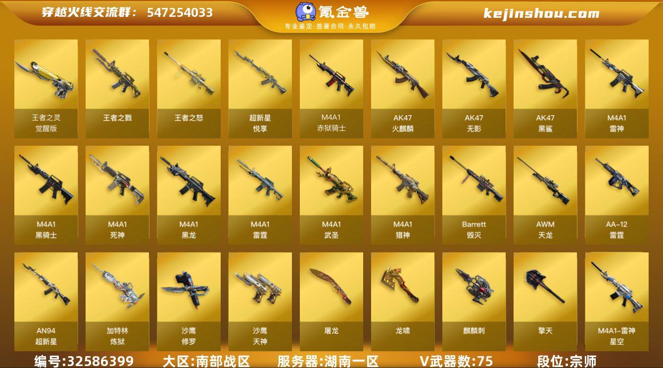 【ky4625】湖南一区-81V-4王者-0炫金 【热门武器】:死亡之眼,M4A1-黑骑士,加特林-炼狱,沙鹰-修罗 【王者炫金武器】:王者之戮,超新星-悦享,王者之怒 【音效卡】:AK47-火麒麟音效卡,M4A1-雷神音效卡,Barrett-毁灭音效卡 【皮肤】:雷神-能量核心,雷神-星空,火麒麟-雷神,毁灭耀金皮肤,黑龙-暗月,无影-能量核心,天龙-能量核心 【角色】:零,葵,樱,瞳,炫,审判者,王者复仇,堕落女神,娟娟,兰-海滩派对,零-水下丽影,维纳斯,新娜塔莎 【人偶武器】:COP-旗袍 【暴走生化】:死亡之眼,超级对讲机 【英雄级武器】:AK47-火麒麟,M4A1-黑龙*2,M4A1-雷神*4,M4A1-黑骑士,AK47-无影*2,M4A1-死神,AN94-超新星,M4A1-武圣,AK47-黑鲨*4,M4A1-雷霆*2,M4A1-猎神*2,AWM-天龙,Barrett-毁灭,Barrett-金色蔷薇*4,加特林-炼狱,AA-12-雷霆*2,沙鹰-修罗,沙鹰-天神*3,COP-雷霆*2,王者之灵-觉醒版,屠龙*2,龙啸*8,擎天,麒麟刺*3,高爆手雷-雷霆*7,闪光弹-雷霆*7,烟雾弹-雷霆*7,M4A1-赤狱骑士 【道具】:亚洲杯纪念炫彩背包,炫彩背包,女皇终结者-魔龙之吻,救世主-黑桃战神,绿色巨人,灵魂忍者,变异宝贝,迷雾幽灵,夺命之镰,防化服*3,流光-鎏金...