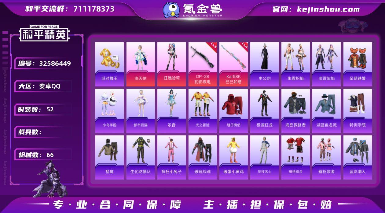 【kyhp1148】安卓 手Q-2粉装-6特效枪-0载具-0粉色飞行器-18377热力值-2王牌印记-52套装-66枪皮 【热门品类】:套装-派对舞王 【粉色套装】:角色-洛天依,角色-狂魅哈莉 【粉色枪皮等级】:ACE32-萌骑漫游(二级),AKS-74U-森灵之息(五级),Kar98K-巳巳如意(四级),Mk14-福马献瑞(五级),AA12-G-萌骑幻想(二级),DP-28-豹影疾电(五级) 【粉色枪皮】:ACE32-萌骑漫游,AKS-74U-森灵之息,Kar98K-巳巳如意,Mk14-福马献瑞,AA12-G-萌骑幻想,DP-28-豹影疾电 【粉色降落伞】:洛神天依降落伞,绯穹魔姬降落伞,异瞳寒姬降落伞,炫彩糖果降落伞 【稀有套装】:套装-小鸟芋圆,套装-雪国风尚,套装-马上有钱,角色-都市丽猫,角色-乐音,套装-朱霞炽焰,套装-凌霄紫焰,角色-申公豹,套装-雨过天青,套装-红釉青花,角色-霜纹水星,角色-缚爪幽影,角色-幻步猫灵,角色-孙斩天 【稀有枪皮】:AKM-龙的传人,M16A4-幻世战舞者,M16A4-绒绒猫尾,QBZ-洛神天依,Mk47-洛神天依,蜜獾-虎痴许褚,蜜獾-绯穹魔姬,ARX-凌霄紫焰,UZI-影袭,UZI-炫彩节奏,汤姆逊-天降萌叽,汤姆逊-像素花束,JS9-凌霄紫焰,M24-影袭,S686-生命誓言,MG3-幻世战舞者,MG-36-凌霄紫焰,P92-凌霄紫焰,短管霰...