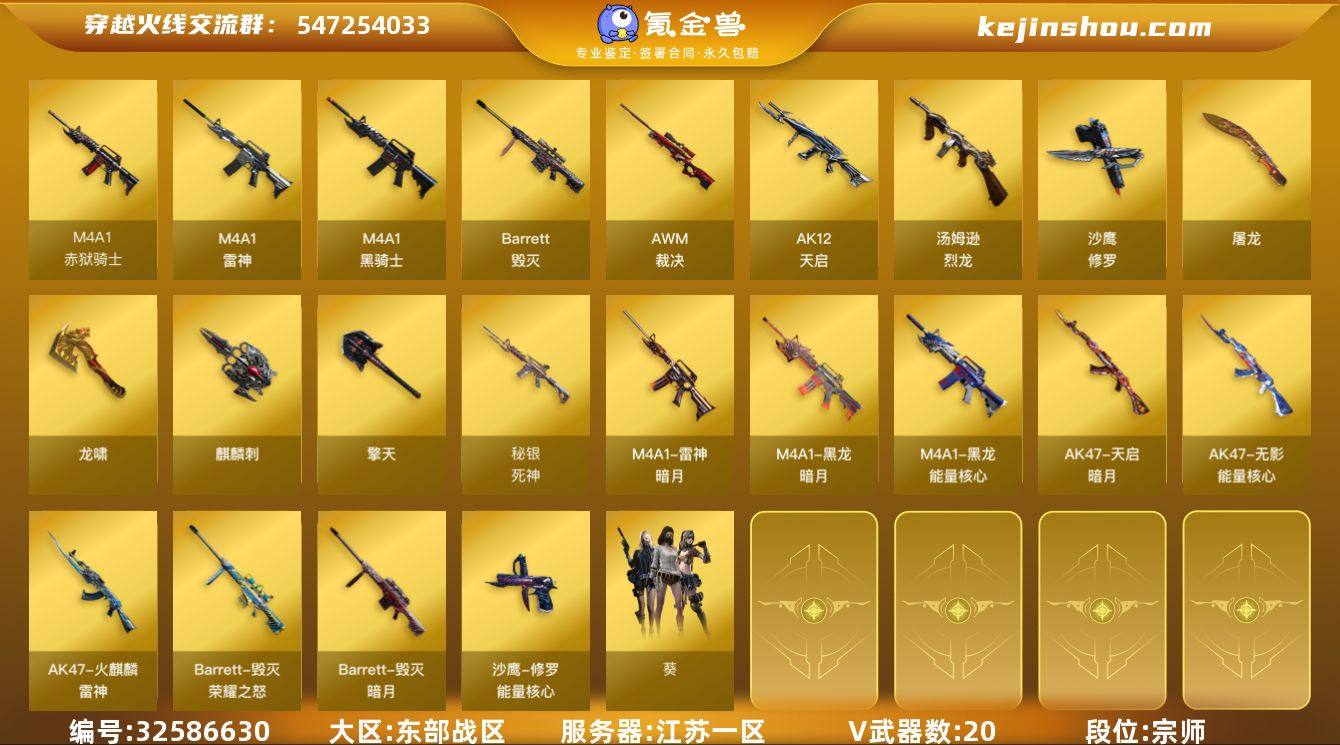 【ky4661】江苏一区-21V-0王者-0炫金 【热门武器】:死亡之眼,M4A1-黑骑士,汤姆逊-烈龙*6,沙鹰-修罗*4 【皮肤】:雷神-暗月,雷神-源计划2.0专属 皮肤,火麒麟-雷神,毁灭-暗月,毁灭-荣耀之怒,黑龙-能量核心,黑龙-暗月,无影-能量核心,死神-秘银,天启-暗月,修罗-能量核心,天神-暗月 【角色】:葵,风暴女 【人偶武器】:迷你牛牛 【暴走生化】:死亡之眼 【英雄级武器】:M4A1-雷神,M4A1-黑骑士,AK12-天启,Barrett-毁灭,AWM-裁决,汤姆逊-烈龙*6,沙鹰-修罗*4,屠龙,龙啸,擎天,麒麟刺,闪光弹-云龙,M4A1-赤狱骑士 【道具】:云山科技背包,战舰背包,炫彩背包,绿色巨人,灵魂忍者,变异宝贝,迷雾幽灵,夺命之镰,防化服*3,枪王排位28赛季金色流光,枪王排位29赛季金色流光,防弹头盔*3,防弹衣*3,C4工具钳*3,手雷包*3 【特殊枪械】:1黑骑士,6烈龙