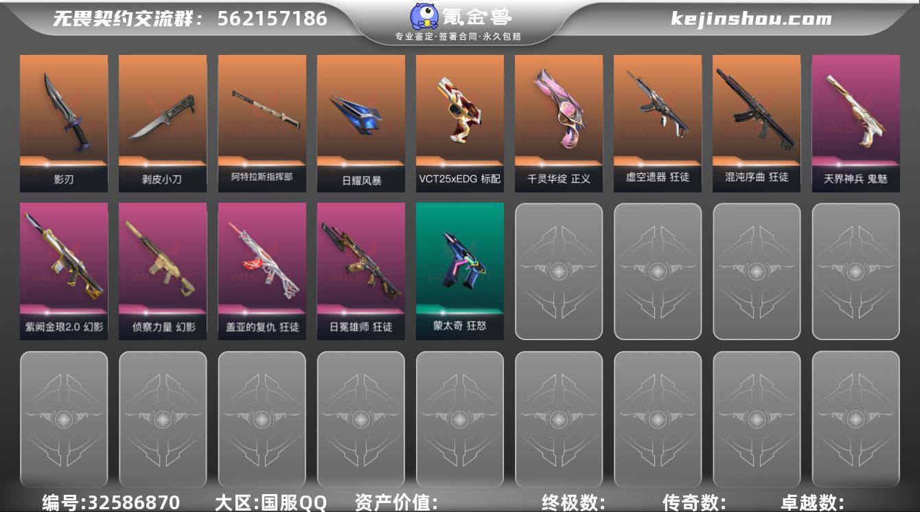 S194095 无畏契约/68等级/青铜段位/20英雄/47皮肤/资产17970/已使用R点630/剩余R点115/虚空遗器-狂徒,混沌序曲-狂徒,紫阙金琅//2.0-幻影,盖亚的复仇-狂徒,侦察力量-幻影,日冕雄师-狂徒,阿特拉斯指挥部-甩棍,日耀风暴-遗器,剥皮小刀,影刃,VCT25-x-EDG-标配,千灵华绽-正义,天界神兵-鬼魅