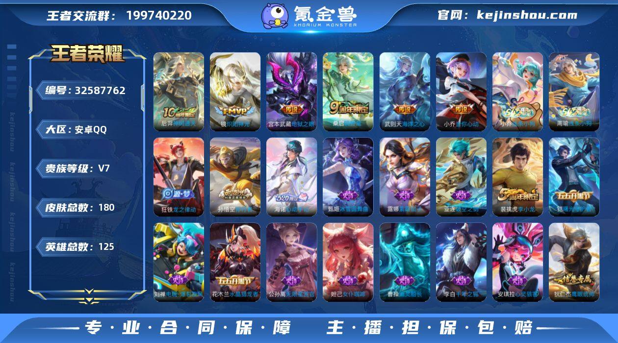 安卓Q-V7-最强王者段位-125英雄-180皮肤-6传说-48史诗HZ2632109 【英雄全皮】:海诺全皮 【传说皮肤】:后羿神树通天,桑启鸣野蒿,小乔音你心动,镜炽阳神光,宫本武藏地狱之眼,武则天海洋之心 【限定皮肤】:蒙犽顽岩魄,蔡文姬夏日便利店,虞姬夏日便利店,姜子牙天穹之誓,狄仁杰阴阳师,赵云皇家上将,孙尚香蔷薇恋人,吕布猎兽之王,狄仁杰魔术师,项羽海滩派对,孙悟空孙行者,裴擒虎李小龙,裴擒虎擒涛扼浪,鲁班大师探海日志,桑启海盐诗旅,张良古海寻踪,高渐离燃音魔法,妲己灵卜魔法,鬼谷子天穹祈灯,沈梦溪龙舞盛年,刘邦剑破天穹,程咬金群星魔术团,镜青焰无极,项羽苍威无极,海诺心动手记,周瑜熔金海岸 【赛季限定】:桑启海盐诗旅,裴擒虎擒涛扼浪,鲁班大师探海日志,张良古海寻踪,鬼谷子天穹祈灯,刘邦剑破天穹,姜子牙天穹之誓,东皇太一噬灭天穹,太乙真人谧流熔炉,钟馗虚灵犬护,甄姬逆浪荇歌,亚瑟荣光之誓 【战令限定】:吕布猎兽之王,高渐离燃音魔法,妲己灵卜魔法,镜青焰无极,项羽苍威无极,蔡文姬夏日便利店,虞姬夏日便利店,亚连破空之剑,孙悟空神迹守卫,周瑜线条小狗,小乔线条小狗 【史诗皮肤】:周瑜线条小狗,小乔线条小狗,狂...
