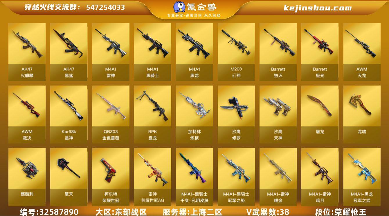 【ky5106】上海二区-41V-2王者-0炫金 【热门武器】:QBZ03-金色蔷薇,M200-幻神,荣耀世冠-柯尔特,Kar98K-星神,M4A1-黑骑士,RPK-盘龙,加特林-炼狱,沙鹰-修罗 【音效卡】:M4A1-黑骑士音效卡,Barrett-毁灭音效卡 【皮肤】:雷神-暗月,雷神-耀金皮肤,雷神-冠军之魄,雷神-荣耀世冠AG,火麒麟-华夏之心,火麒麟-轻羽皮肤,火麒麟-平天大圣,火麒麟-百城,毁灭-战神张飞,毁灭-黑大圣皮肤*2,毁灭-英雄计划 皮肤,M4A1-千变-孔明皮肤,黑龙-暗月,黑龙-冠军之武,黑骑士-冠军之势,战神-粉色甜心皮肤,战神-紫绶金章皮肤,AK47-B-常胜将军-刘备,AK47-B-常胜将军-孙权,天龙-能量核心,AWM-天龙-传奇70KG,AWM-天龙-传奇白鲨,极光-能量核心,屠龙-荣耀世冠AG,轻型军用手斧-再燃火线 【角色】:葵,樱,王者-迷迭香,乔伊教练,芳心审判者,灵狐者-X,灵狐者-黄金海岸,龙儿-小淘气,潘多拉-甜心教官,青霞仙子,蜀雪 【人偶武器】:迷你艾比 【挑战大师】:冰龙粉碎者-白马银枪,激光毁灭者III 【英雄级武器】:AK47-火麒麟*2,M4A1-黑龙*2,M4A1-雷神*3,M4A1-黑骑士,AK47-黑鲨,QBZ03-金色蔷薇,AWM-天龙,Barrett-毁灭*2,Barrett-极光,AWM-裁决,M200-幻神,Kar98...