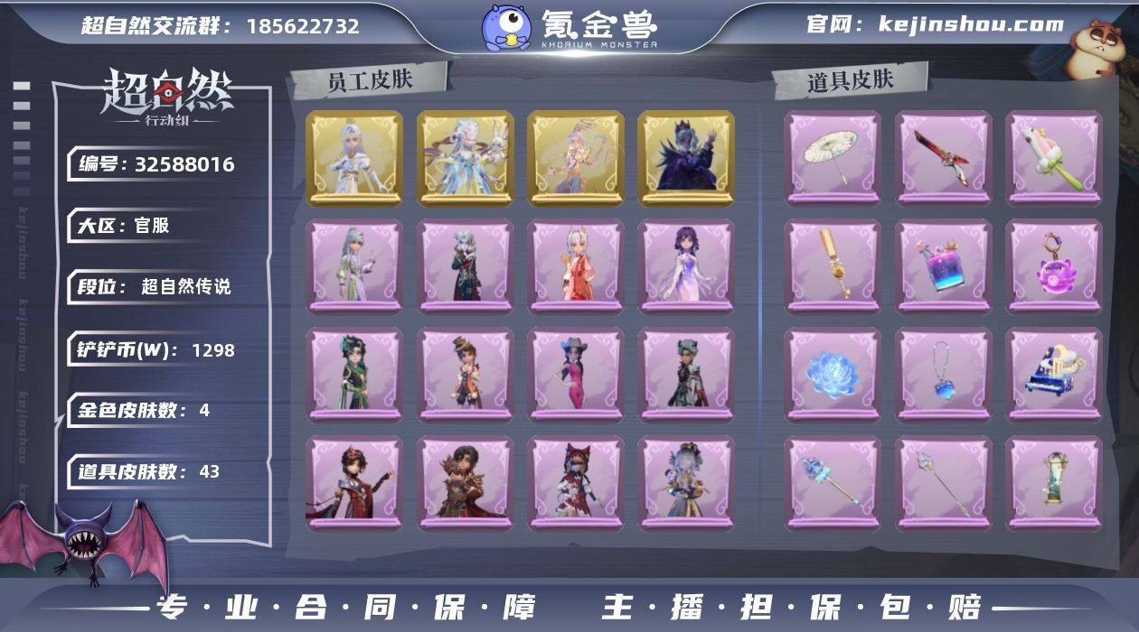 金皮4;紫皮20;道具皮43;皮肤:零-渡鸦公爵,莉莉-瑶台梦,逍遥-剑仙,逍遥-莲华渡,艾伦-黎明猎手,逍遥-绣春逍影,逍遥-万迭云华,巫铃儿-琢玉怀乡,零-搬开山,莉莉-除妖小师妹,小黄-呱呱雨衣,爱丽丝-耀眼的你,莉莉-莓果陷阱,零-磨砺成锋,莉莉-情公主,爱丽丝-丝缕哀歌,阿念-王子与骑士,薇薇安-仙锋小姐,巫铃儿-素影瑶光,临云-织锦云程,零-青云逸歌,薇薇安-黑月挽歌,爱德华-梵卓之礼,阿念-庆宴绮愿;道具:刺刀-紫气东来,长枪-波塞冬,闪光弹-金戈玄铜,音响-月光奏鸣曲,腰包-月下莲台,喷气背包-乘风溯雪,短管猎枪-星光的裁决,长鞭-新春炸响,电击枪-权杖的许诺,转轮手枪-新星时代,闪光弹-邪恶滚滚猫,伞-郁金春信,急救包-末章心跳,夜视仪-金丝眼镜,折扇-赴此良宵,专业手电-云端梦想计划,桃木剑-永眠曲,摸金符-焦糖纪元,夜视仪-敛花容,刺刀-碧络琅环,音响-鸣沙鼓,传送按钮-逆时审判,除颤仪-冰晶般的代价,铲子-赞萌波板糖,长鞭-缚誓之锁,急救包-蔷薇物语,黄牛能量饮料-星空特调,专业手电-星寂,铲子-龙鳞,荧光棒-花火-荧光棒-花火,摸金符-紫霄,铲子-圣心之泪,摸金符-花落精绝,刺刀-美鲨匕首,腰包-红运福虎,短管猎枪-赞萌露比水枪,长枪-罪棘,专业手电-花束般的告白,长鞭-小狗蛇点点鞭,桃木...