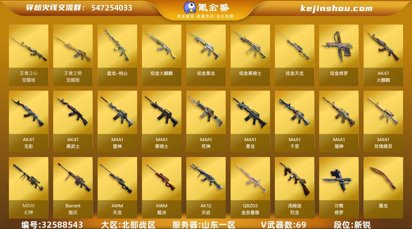 【ky5264】山东一区-77V-5王者武器数-7炫金武器数 【热门武器】:QBZ03-金色蔷薇,M200-幻神,M200-竞技荣光,死亡之眼*3,M4A1-黑骑士,汤姆逊-烈龙*4,降世魔童,沙鹰-修罗*3 【王者炫金武器】:盘龙-悦心,炫金火麒麟,炫金骑士,炫金黑龙,炫金天龙*3,炫金修罗 【音效卡】:AK47-火麒麟音效卡,M4A1-黑龙音效卡,Barrett-毁灭音效卡 【皮肤】:幻神-周瑜皮肤,幻神-KZ-CFPLS25冠军 皮肤,幻神-电竞之星 皮肤,雷神-能量核心,雷神-荣耀之魄,雷神-虎将,雷神-宠儿-2019MVP,火麒麟-雷神,火麒麟-冠军之心,毁灭-荣耀之怒,毁灭耀金皮肤,黑龙-能量核心,黑龙-暗月,黑骑士耀金皮肤,无影-能量核心,战神-粉色甜心皮肤,战神-紫绶金章皮肤*4,战神-流金岁月皮肤*4,AWM-天龙-传奇白鲨,修罗-能量核心,屠龙-荣耀之锋 【角色】:葵,魅影,王者春,乔伊教练,修道士,暗夜-X,初恋灵狐,嘉年华灵狐,娟娟,兰-海滩派对,龙儿-小淘气,潘多拉-X,潘多拉-甜心教官,潜龙队-X,蛇姬,新娜塔莎 【人偶武器】:火麒麟-灵狐,AWM-灵狐-15周年嘉年华,COP-旗袍,闪光弹-小乔,降世魔童 【暴走生化】:死亡之眼*3,超级对讲机 【挑战大师】:冰龙粉碎者-白马银枪,激光毁灭者III,...