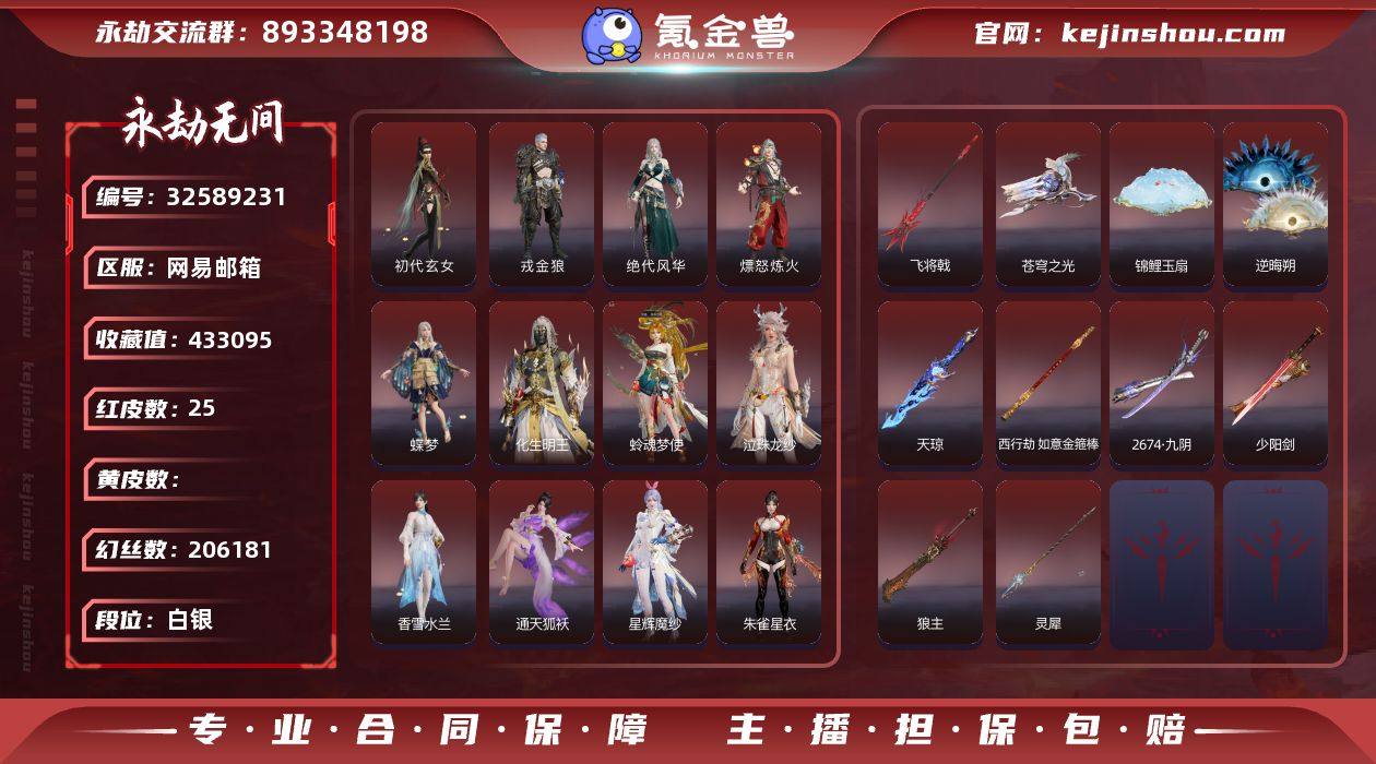 WJ5555,网易QQ邮箱,4月22日可换绑,1谪星,25红599金,等级441,收藏值433095,三人段位白银1,幻丝206181,金砖180,通行证Lv.1,声望4,御祥云,神君印,谪星无定法,2孔,1黄,1蓝,红色神品,香雪水兰,绝代风华,监兵凶神,夜魅游莹,通天狐袄,星辉魔纱,朱雀星衣,流金晓锦,化生明王,戎金狼,初代玄女,熛怒炼火,蝶梦,蛉魂梦使,泣珠龙纱,苍穹之光,狼主,飞将戟,灵犀,如意金箍棒,少阳剑,天琼,锦鲤玉扇,逆晦朔,2674九阴,角色金色皮肤,禄运玉霄,紫微星命,藏雨阁主,金襦玉衫,仲夏霜华,小青,赤丹朱湛,寒英素雪,麟鹿大铠,花之倾奇,苍雷丸,不知火舞,青鸟,神鹰之女,火罗圣女,惊云羽,浣烟纱,瀚海苍鹰,福瑞天泽,秋神蓐收,悟空,行空裘,英雄袍,干将莫邪,冬神玄冥,广目天王,日影花阴,黄昏巫主,云溪仙子,悠竹萌客,街头狂欢涂鸦少女,腓腓,絮云衣,夜绸袍,热力节拍,金财聚辉,赤焰战灵,山漠狞影,雪铃绮歌,高校水着,热海白珊,过江龙,嘉果花,造景,墨双戟-不归,火罗卫,竹霹雳,貔貅吞宝,吞海鲛,丹鹤,夜观灯,虎踞,迎宵,鹦鹉螺,炉中火,星追月,心魔,月虹弦角,乌木弓,豹胎易筋弓,逆逢,仙毫,苍雷破,毛乎乎,烛...