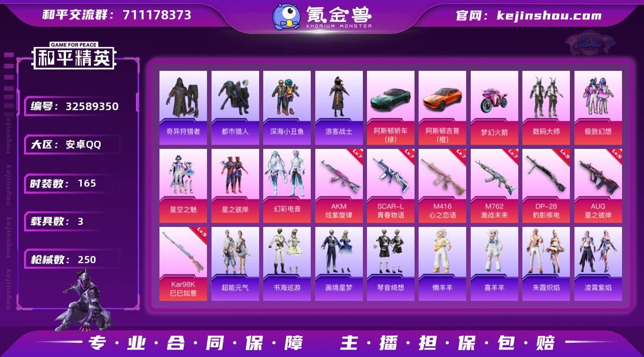 【HPN2073】165套装/枪械10/装备281/载具3/战备157/王牌印记14/热力值82145/七级AKM-炫紫旋律/七级SCAR-L-青春物语/七级M416-心之恋语/五级AUG-星之彼岸/七级M762-激战未来/四级UMP45-萌骑冒险/五级AKS-74U-森灵之息/五级Kar98K-巳巳如意/五级Mk14-福马献瑞/五级DP-28-豹影疾电/浪漫天命/都市猎人/深海小丑鱼/奇异狩猎者/浪客战士/粉红小猪/数码大师/极致幻想/星空之魅/星之彼岸/幻彩电音/角色-月中灵/阿斯顿·马丁DBS(绿)/阿斯顿·马丁DBX(橙)/双人摩托-梦幻火箭/AKM炫紫旋律/SCAR-L青春物语/M416心之恋语/AUG星之彼岸/M762激战未来/UMP45-萌骑冒险/AKS-74U-森灵之息/Kar98K-巳巳如意/Mk14-福马献瑞/DP-28-豹影疾电/梦幻火箭飞行器/飞行器-潮汐统领/深海曼妙降落伞/幻影战神降落伞/百万伏特降落伞/春暖花开降落伞/梦幻火箭降落伞/繁花小夜曲降落伞/星之彼岸降落伞/未来歌姬降落伞/千金淑猫降落伞/樱桃泡泡降落伞/冷漠罗丽降落伞/喜羊羊与灰太狼降落伞/炫彩糖果降落伞/巳巳如意/超能元气/角色-幸运青/套装-马上有钱/糖糖葫芦/青团波波/摩登魅猫/燕燕于飞/鱼渊荷华/晶辉守护/樱梦幻音/粉恋花/紫幽梦/蓝冰羽/星渊小夜曲/彩虹兔/云朵鹅/雪绒豹/夜瞳黯灵/朱霞炽焰/凌霄紫焰/擎苍青焰...