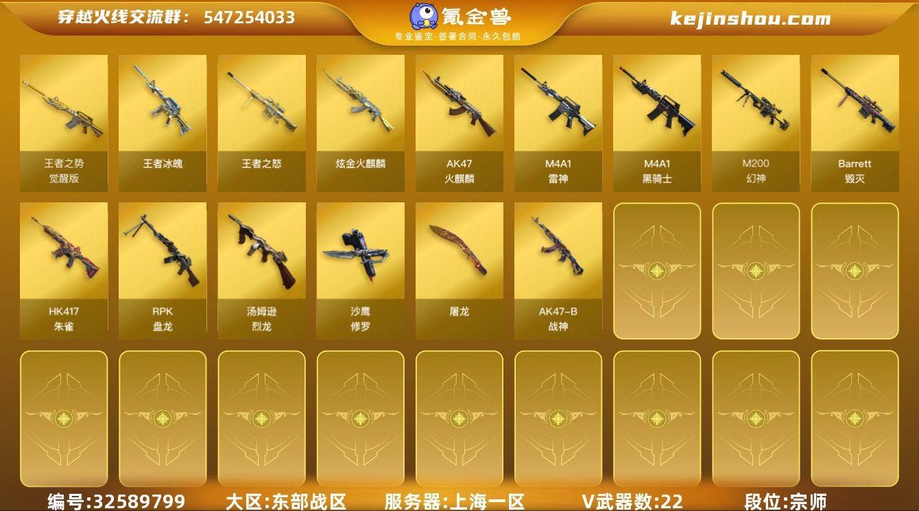 【ky5653】上海一区-25V-6王者武器数-1炫金武器数 【热门武器】:HK417-朱雀,M200-幻神,M4A1-黑骑士,汤姆逊-烈龙*5,RPK-盘龙,沙鹰-修罗*3 【王者炫金武器】:王者冰魄,王者之怒,炫金火麒麟 【音效卡】:M4A1-黑骑士音效卡,Barrett-毁灭音效卡 【皮肤】:雷神-荣耀之魄,毁灭-英雄计划 皮肤,极光-能量核心 【角色】:暗夜-X,初恋灵狐,娟娟,兰-新年限定,潘多拉-X,潘多拉-甜心教官,潜龙队-X,蛇姬,影武者-X 【人偶武器】:闪光弹-小乔 【暴走生化】:超级对讲机 【挑战大师】:激光毁灭者III-白马银枪 【英雄级武器】:AK47-火麒麟,M4A1-雷神,M4A1-黑骑士,HK417-朱雀,王者之势-觉醒版,AK47-B-战神,Barrett-毁灭,M200-幻神,RPK-盘龙,汤姆逊-烈龙*5,沙鹰-修罗*3,屠龙 【道具】:炫彩背包,超级背包,女皇终结者-魔龙之吻,救世主-黑桃战神,绿色巨人,灵魂忍者,迷雾幽灵,夺命之镰,防化服*2,枪王排位29赛季金色流光,防弹头盔*2,防弹衣*4,C4工具钳*3,手雷包*2 【特殊枪械】:1黑骑士,5烈龙,1盘龙