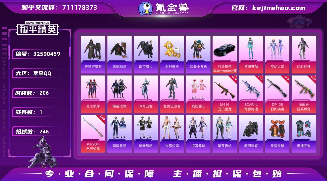 【kyhp1123】苹果 手Q-8粉装-8特效枪-1载具-2粉色飞行器-83694热力值-6王牌印记-206套装-246枪皮 【热门品类】:粉装-梦幻火箭,套装-浪漫天命,套装-赤蝎幽灵,套装-都市猎人,套装-派对舞王,套装-深海小丑鱼,套装-小丑鱼,套装-奇异狩猎者,套装-金羽特工,套装-龟仙人,套装-暗影哥特 【粉色套装】:粉装-幻影战神,粉装-梦幻火箭,粉装-星之彼岸,粉装-暗夜玫瑰,粉装-吟月归客,角色-复仇流浪者,粉装-飒粉甜心,角色-异瞳寒姬 【粉色枪皮等级】:SCAR-L-青春物语(六级),M416-五爪金龙(七级),ACE32-萌骑漫游(五级),汤姆逊-怪笑疯兔(五级),AKS-74U-森灵之息(五级),Kar98K-巳巳如意(五级),Mk14-福马献瑞(五级),DP-28-豹影疾电(五级) 【粉色载具】:玛莎拉蒂Quattroporte(夜幕蓝) 【粉色枪皮】:SCAR-L-青春物语,M416-五爪金龙,ACE32-萌骑漫游,汤姆逊-怪笑疯兔,AKS-74U-森灵之息,Kar98K-巳巳如意,Mk14-福马献瑞,DP-28-豹影疾电 【粉色飞行器】:春暖花开飞行器,梦幻火箭飞行器 【粉色降落伞】:绝对恒星降落伞,幻影战神降落伞,梦幻火箭降落伞,银刃赛罗降落伞,香水柠檬降落伞,星之彼岸降落伞,林间仙鹿降落伞,橘柚倾心降落伞,筑梦精灵降落伞,垂柳...