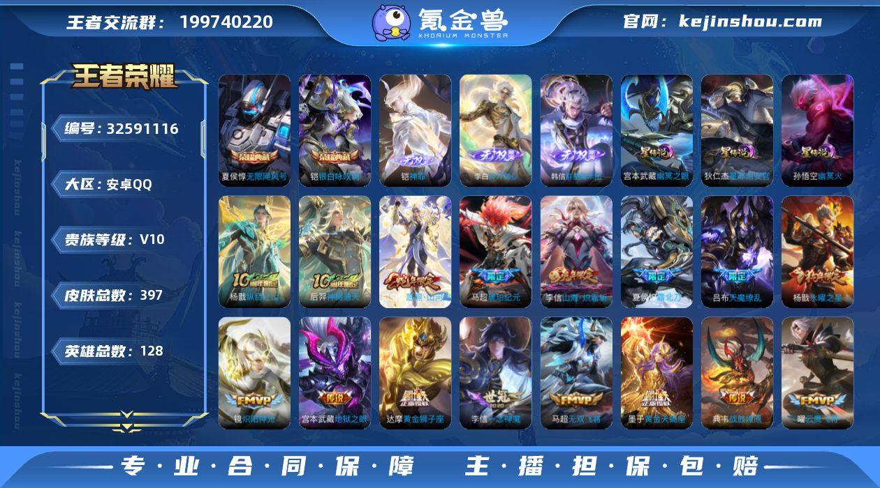 可换绑【V10精品号·铠全皮·铠夏侯惇双典藏·铠韩信李白3无双·黄金天蝎座·影龙天霄·鹤羽星尊·狗年杨戬·天魔缭乱·多传说限定号】27按键,3星传说,1小兵,30戳戳,13王者印记,五级铭文170,可二次CD18343,安卓Q-V10-396皮肤-2典藏皮肤-3无双-39传说-121史诗【英雄全皮】:刘禅全皮,铠全皮,司空震全皮,戈娅全皮,影全皮【荣耀典藏】:夏侯惇无限飓风号,铠银白咏叹调【无双皮肤】:铠神罪,韩信群星魔术团,李白碎月剑心【小兵皮肤】:小兵青铜锵锵兵【星元皮肤】:宫本武藏幽冥之眼,孙悟空幽冥火,狄仁杰星际治安官【传说皮肤】:杨戬纵目迁山,后羿神树通天,司空震愿照山河定,云缨幻光神枪,桑启鸣野蒿,夏侯惇霜北刀,铠冥王哈迪斯,墨子黄金天蝎座,典韦战鼓燎原,马超琥珀纪元,铠琥珀纪元,艾琳觅芳踪,鲁班七号时之奇旅,兰陵王影龙天霄,宫本武藏惊梅引,东皇太一灼幽烈阳,诸葛亮鹤羽星尊,张飞百相守梦,李信山海炽霜斩,李白诗剑行,马超无双飞将,孙策末日机甲,孙尚香异界灵契,李元芳飞鸢探春,铠绛天战甲,镜炽阳神光,虞姬启明星使,关羽武圣,曜云鹰飞将,李信一念神魔,干将莫邪久胜战神,达摩黄金狮子座,梦奇胖达荣荣,杨戬永曜之星,貂蝉仲夏夜之梦...