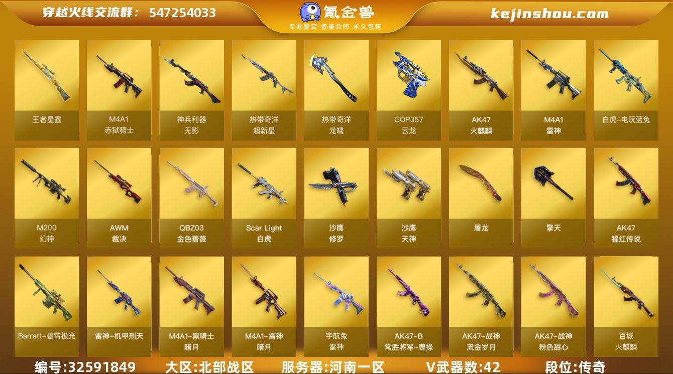 【ky5987】河南一区-41V-1王者武器数-0炫金武器数 【传说角色】:传说影煞 【热门武器】:QBZ03-金色蔷薇,Scar Light-白虎,M200-幻神,白虎-电玩蓝兔,沙鹰-修罗 【王者炫金武器】:王者星霆 【音效卡】:M200-幻神音效卡,Barrett-碧霄极光音效卡 【皮肤】:幻神-宠儿-2021MVP,雷神-暗月,雷神-荣耀之魄,雷神-机甲刑天皮肤,雷神-宇航兔皮肤,火麒麟-平天大圣,火麒麟-百城,火麒麟-心动糖果,黑骑士-暗月*2,战神-粉色甜心皮肤,战神-流金岁月皮肤,AK47-B-常胜将军-曹操,屠龙-星火燎原 【角色】:零·纪元,战地猎狐,奇洋探员,乔伊教练,云海玲珑,暗夜-X,初恋灵狐,芳心审判者,嘉年华灵狐,猎狐者-追月,灵狐者-X,灵狐者-七夕宝贝,麻雀,曼陀罗-X,曼陀罗-礼服,潘多拉-X,潘多拉-甜心教官,斯沃特-X,蜀雪,兔囡囡,樱-战斗天使 【人偶武器】:M4A1-雷神-精英刀锋,AWM-灵狐-15周年嘉年华,迷你艾比,迷你超能女侍 【暴走生化】:超级对讲机 【挑战大师】:冰龙粉碎者-白马银枪,激光毁灭者III-白马银枪 【英雄级武器】:AK47-火麒麟,M4A1-雷神,Scar Light-白虎,无影-神兵利器,超新星-热带奇洋,QBZ03-金色蔷薇,AK-47-猩红传说*3,白虎-电玩蓝兔,AWM-裁...
