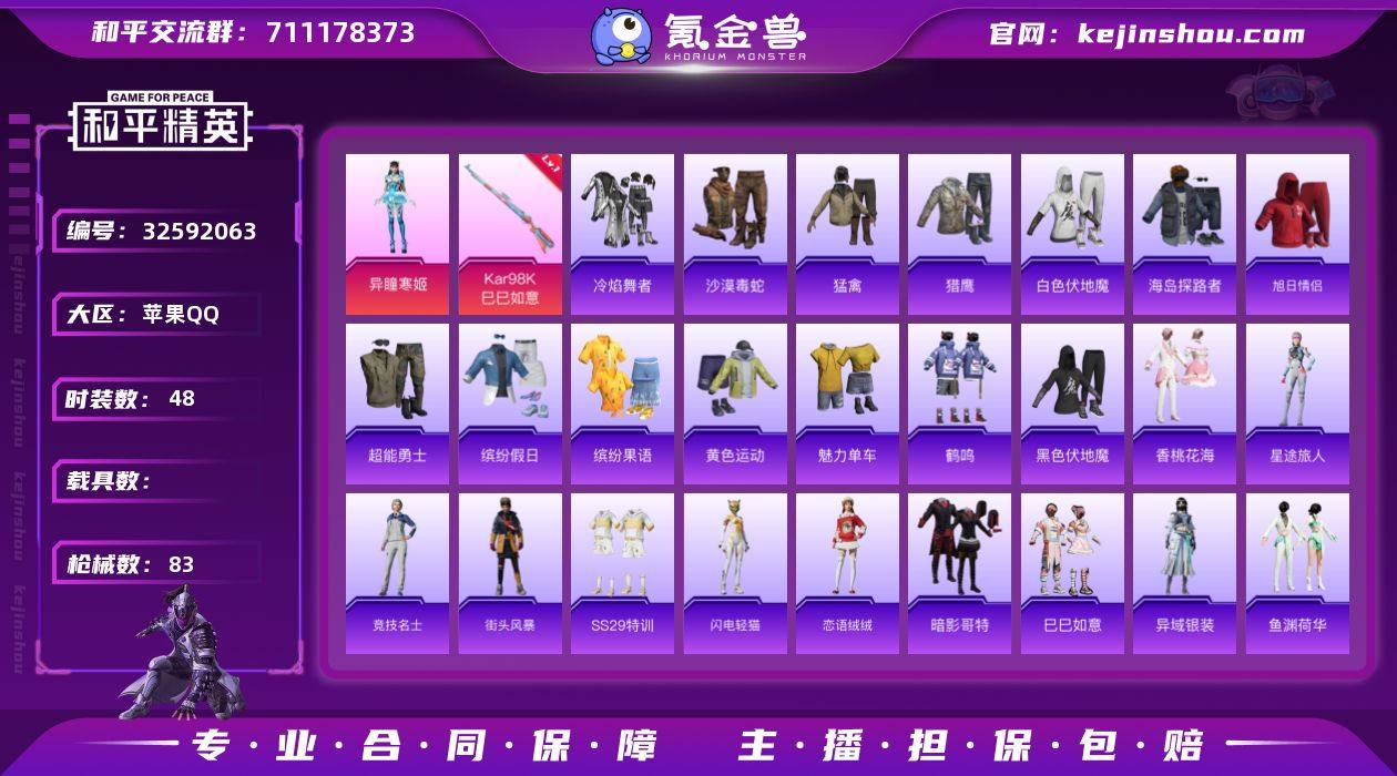 QY463 极品女号 红眼罩 异瞳寒姬 瑰梦爱神 暗影哥特 Alan Walker 1太阳 苹果Q区-1粉装-2特效枪-19232热力值-4王牌印记-48套装-83枪皮【优质套装】: 异瞳寒姬【特效枪等级】:Kar98K-巳巳如意(五级- Kar98K-巳巳如意)【优质武器皮肤】: Kar98K-巳巳如意【稀有武器皮肤】: SCAR-L-海盐豹豹 Kar98K-巳巳如意 20-H-乌木金纹 PKM-紫幽梦 Mk14-紫幽梦 蜜獾-乌木金纹 S1897-紫幽梦 P92-紫幽梦 PKM-啾咪啾咪 M416-红色方程式 M416-蓝色火焰 AKM-破晓战魂 SCAR-L-红色方程式 SCAR-L-玉兔迎春 SCAR-L-夜灯 SCAR-L-炫彩节奏 M16A4-红色方程式 AUG-耀粉歌者 AUG-青春冒险家 M762-彩虹符号 M762-天降萌叽 M762-萌物绒绒 AC-VAL-闲梦青缨 Kar98K-红色方程式 Mini14-耀粉歌者 Mk14-治愈之星 UZI-红色方程式 UZI-天降萌叽 UZI-啾咪啾咪 UMP45-夜灯 汤姆逊-耀粉歌者 汤姆逊-炫彩节奏 P90-乌木金纹 P90-玩趣呆呆 S12K-夜灯 DBS-彩虹符号 M249-破晓战魂 M249-糯团青竹 DP-28-彩虹符号 MG3-幻世战舞者 MG3-妙红点点 UZI-绿洲时空 蝎式手枪-千金淑猫 AUG-异域银装 20-H-星途旅人 野牛-燕燕于飞 M200-乌木金纹 SPAS-12-燕燕于飞 蝎式手枪-燕燕于飞 十字弩-异域银装 SCAR-L-星途旅人 S686-巳巳如...