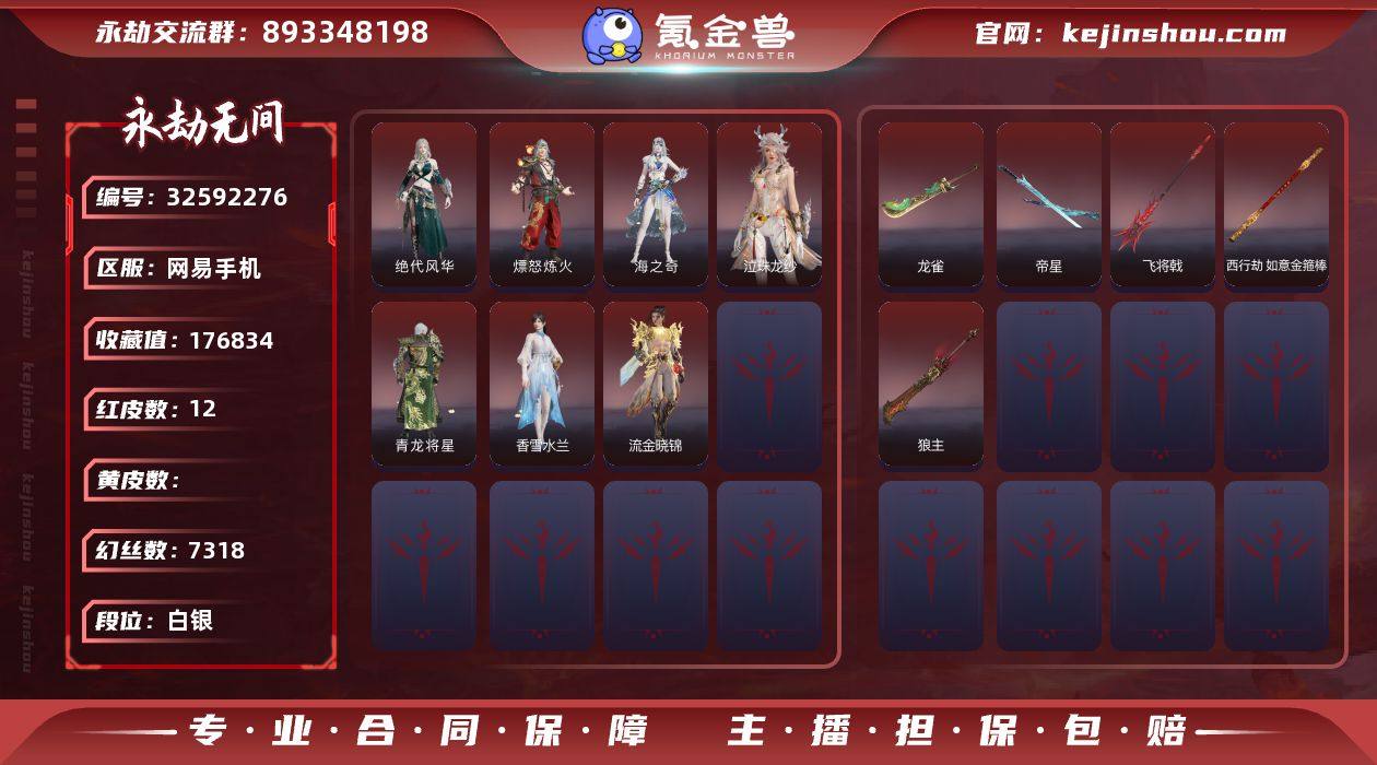 WJ5574,网易手机,可换绑,三人段位白银1,声望2,12红,201金,等级242,收藏值176834,幻丝7318,金砖27,通行证Lv1,红色神品,香雪水兰,绝代风华,流金晓锦,熛怒炼火,泣珠龙纱,海之奇,青龙将星,龙雀,狼主,飞将戟,如意金箍棒,帝星,角色金色皮肤,金襦玉衫,赤丹朱湛,祸津素盏,麟鹿大铠,凛冬,瀚海苍鹰,英雄袍,春不敛,卷王,夜绸袍,沙海之鸠,孤影戎装,若水尊者,萍之缘,红蓝狂想,斗罗大陆唐三,炽羽,康复之星,游四海,夜华朝,耀世魂花,九阴圣女,春桃笑,御宅花织,清雅少女,妖刀姬,无拘,新魔杰斩魔天将,过江龙,学宫之杖,倒马棍,2674超越型,财神剑,隐锋,紫金宝剑,桡尺刀,仙舞,华夏神兵马首刀,青峰叠扇,耀夜流华,叶底花,咯咯,嘶风,镇魔杵,九霄寒,玉矩,精武,胧夜狐影,蛋仔派对咸鱼,天威,西摩格镰,破重云,螭龙,含光承影,穷奇,切影,念珠丸,雷赐,烛泪,活动中心手机绑定无法解绑,