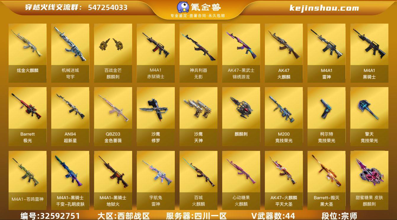 【ky6034】四川一区-47V-1王者武器数-1炫金武器数 【热门武器】:QBZ03-金色蔷薇*2,M200-竞技荣光,M4A1-黑骑士,裁决-雪莉杨,USP-雷暴,沙鹰-修罗 【王者炫金武器】:炫金火麒麟 【音效卡】:枪娘语音包-阿敏,M14EBR-玄武音效卡 【皮肤】:金色蔷薇-枪娘阿敏 皮肤*3,雷神-宇航兔皮肤,雷神-源计划2.0专属 皮肤,M4A1-再燃火线,火麒麟-平天大圣,火麒麟-百城,火麒麟-心动糖果,毁灭-黑大圣皮肤,M4A1-千变-孔明皮肤,黑骑士-地狱火,轻型军用手斧-再燃火线,麒麟刺-甜蜜糖果 皮肤 【角色】:电竞教官-云悠悠,枪娘樱,葵-阿尔法武装,暗夜-X,初恋灵狐,飞虎队-X,嘉年华灵狐,灵狐者-X,灵狐者-七夕宝贝,龙儿-小淘气,曼陀罗-礼服,潘多拉-甜心教官,潜龙队-X,青霞仙子,斯沃特-X,蜀雪,兔囡囡,新娜塔莎,樱-缤纷夏日,影武者-X 【人偶武器】:裁决-雪莉杨,AWM-灵狐-15周年嘉年华,迷你裂空之翼*2,夺魂,迷你牛牛 【暴走生化】:超级对讲机 【挑战大师】:冰龙粉碎者-白马银枪*2,激光毁灭者III-白马银枪,激光毁灭者III,神圣爆裂者-末日III 【英雄级武器】:AK47-火麒麟,M4A1-雷神,M4A1-黑骑士,AN94-超新星,无影-神兵利器,黑武士-锦绣游龙,QBZ03-金色蔷...