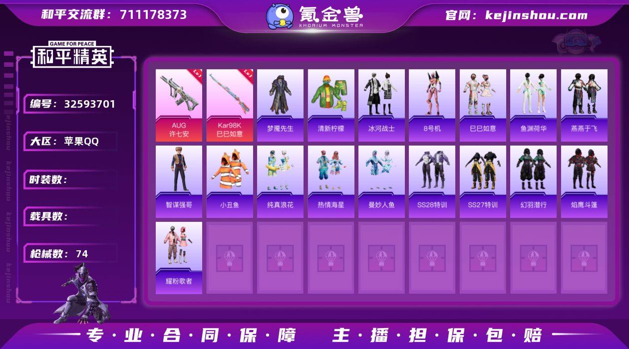 M1047120【AUG-许七安[7级]5特效枪 小丑鱼 金羽特工背包 地铁满天赋素材号】苹果手Q-5特效枪-42套装-74枪皮-1王牌印记-荣耀皇冠Ⅳ-19376热力值【5特效枪】Kar98K-巳巳如意[5级],AUG-许七安[7级],Mk14-福马献瑞[4级],AA12-G-萌骑幻想[2级],AKS-74U-森灵之息[4级]【3稀有】小丑鱼,汤姆逊-奇异狩猎者,AWM-黄金龙骨【1背包】金羽特工背包【108其它衣服和枪皮】SS28特训,曼妙人鱼,角色-8号机,焰鹰斗篷,SS35特训,战术大师,清新柠檬,热情海星,耀粉歌者,长空猛禽,夏日倾情,龙魂突击队,燕燕于飞,黑色伏地魔,鱼渊荷华,烈火街头,梦魇先生,SS37特训,疯狂小兔子,智谋强哥,SS36特训,萌鸡速递,青年教官,角色-白光莹,巳巳如意,红釉青花,SS33特训,SS31特训,雨过天青,元气之梦,SS27特训,SS32特训,狙击之神,潮流炫酷,海盐绵绵冰,纯真浪花,冰河战士,阳光火鸡,幻羽潜行,缤纷果语,SS34特训,AMR-雨过天青,M24-天降萌叽,十字弩-绒兔团圆,SCAR-L-炫彩节奏,S1897-精灵梦叶罗丽,AWM-纯真浪花,汤姆逊-天降萌叽,AUG-异域银装,十字弩-燕燕于飞,P90-巳巳如意,SCAR-L-红色方程式,十字弩-异瞳寒姬,M16A4-幻世战舞者,野牛-燕燕于飞,UMP45-快乐主宰,PKM-蜜语绒猫,SCAR-L-海盐豹豹,SKS-炫彩节奏,汤姆逊-樱桃泡泡,DBS...