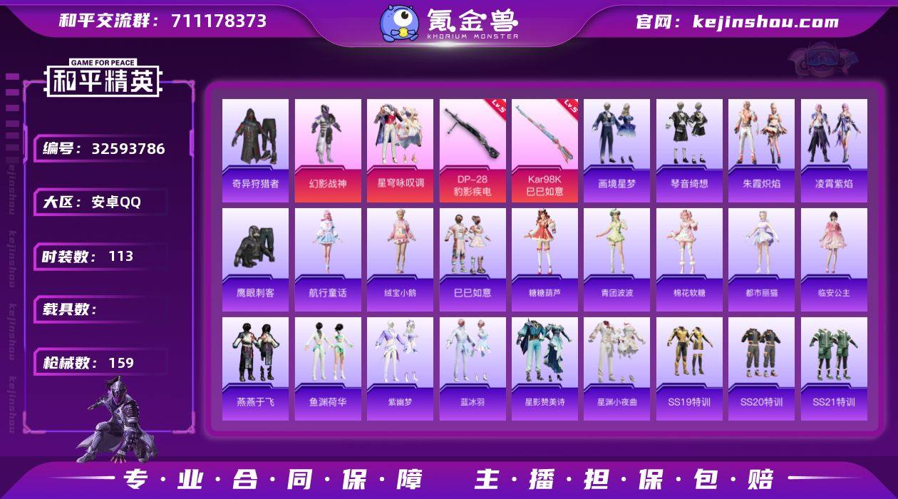 【AZH3282】安卓 手Q【幻影战神 都市丽猫 绒宝小鹅】2粉装-7特效枪-0载具-1粉色飞行器-39540热力值-4王牌印记-113套装-159枪皮 【热门品类】:套装-奇异狩猎者 【粉色套装】:粉装-幻影战神,粉装-星穹咏叹调 【粉色枪皮等级】:ACE32-萌骑漫游(三级),UMP45-萌骑冒险(四级),AKS-74U-森灵之息(五级),Kar98K-巳巳如意(五级),Mk14-福马献瑞(五级),AA12-G-萌骑幻想(三级),DP-28-豹影疾电(五级) 【粉色枪皮】:ACE32-萌骑漫游,UMP45-萌骑冒险,AKS-74U-森灵之息,Kar98K-巳巳如意,Mk14-福马献瑞,AA12-G-萌骑幻想,DP-28-豹影疾电 【粉色飞行器】:脆鲨七海飞行器 【粉色降落伞】:幻影战神降落伞,创世·救赎降落伞,炫彩糖果降落伞 【稀有套装】:套装-航行童话,套装-绒宝小鹅,套装-巳巳如意,套装-雪国风尚,角色-X,套装-马上来财,套装-糖糖葫芦,套装-青团波波,套装-棉花软糖,角色-都市丽猫,角色-临安公主,套装-燕燕于飞,套装-鱼渊荷华,套装-紫幽梦,套装-蓝冰羽,套装-星影赞美诗,套装-星渊小夜曲,套装-朱霞炽焰,套装-凌霄紫焰,套装-画境星梦,套装-琴音绮想,角色-霜刃之御,套装-雨过天青,套装-红釉青花,角色-绯影武装 【稀有枪皮】:AKM-奇异狩猎者...
