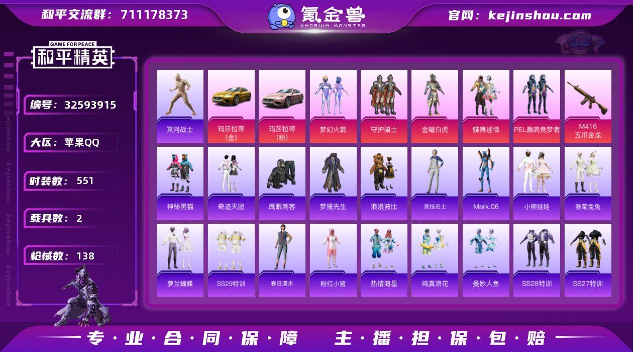 AL691791 【(极品精氪男神伤感身法素材一手号!)主页好看 地铁有天赋 热门:木乃伊 熔岩游骑兵面罩 小恶魔头饰 粉红小猪 雪山精英 浪漫波比 奇迹天团 拳皇97八神庵 熔岩游骑兵连帽夹克 沙漠毒蛇 沙暴袭击者 森林猎手 幻世尖兵 众神之王 神秘黑猫 逆风勇士 新螳螂 M416-五爪金龙7级 金曜白虎 守护骑士 梦幻火箭 蝶舞迷情 PEL轰鸣竞梦者 玛莎拉蒂(金色) 玛莎拉蒂(粉) 梦幻火箭飞行器 春暖花开飞行器 深海曼妙飞行器 PEL轰鸣竞梦者飞行器 春暖花开背包 折纸暴龙背包 炫彩节奏背包 梦幻火箭头盔 雪国精灵头盔 (连体王者)】 热力值54434 枪皮数量138 粉装数5 套装数量131 时装数551 载具数2 战备数93 其他武器皮肤137 头盔58 动作32 伙伴3 其他武器皮肤:Mk47-乌木金纹,SCAR-L-乌木金纹,SCAR-L-红色方程式,SCAR-L-黄金龙骨,SCAR-L-炫彩节奏,GROZA-彩虹符号,GROZA-影袭,GROZA-银河战甲,GROZA-乌木金纹,GROZA-海盐豹豹,GROZA-春暖花开,AKM-虎虎生威,AKM-PEL轰鸣竞梦者,AKM-春暖花开,AKM-破晓战魂,AKM-乌木金纹,AKM-折纸暴龙,M416-蓝色火焰,M416-红色方程式,M416-乌木金纹,AUG-乌木金纹,AUG-耀粉歌者,AUG-天降萌叽,QBZ-乌木金纹,QBZ-原初圣火,QBZ-银河...