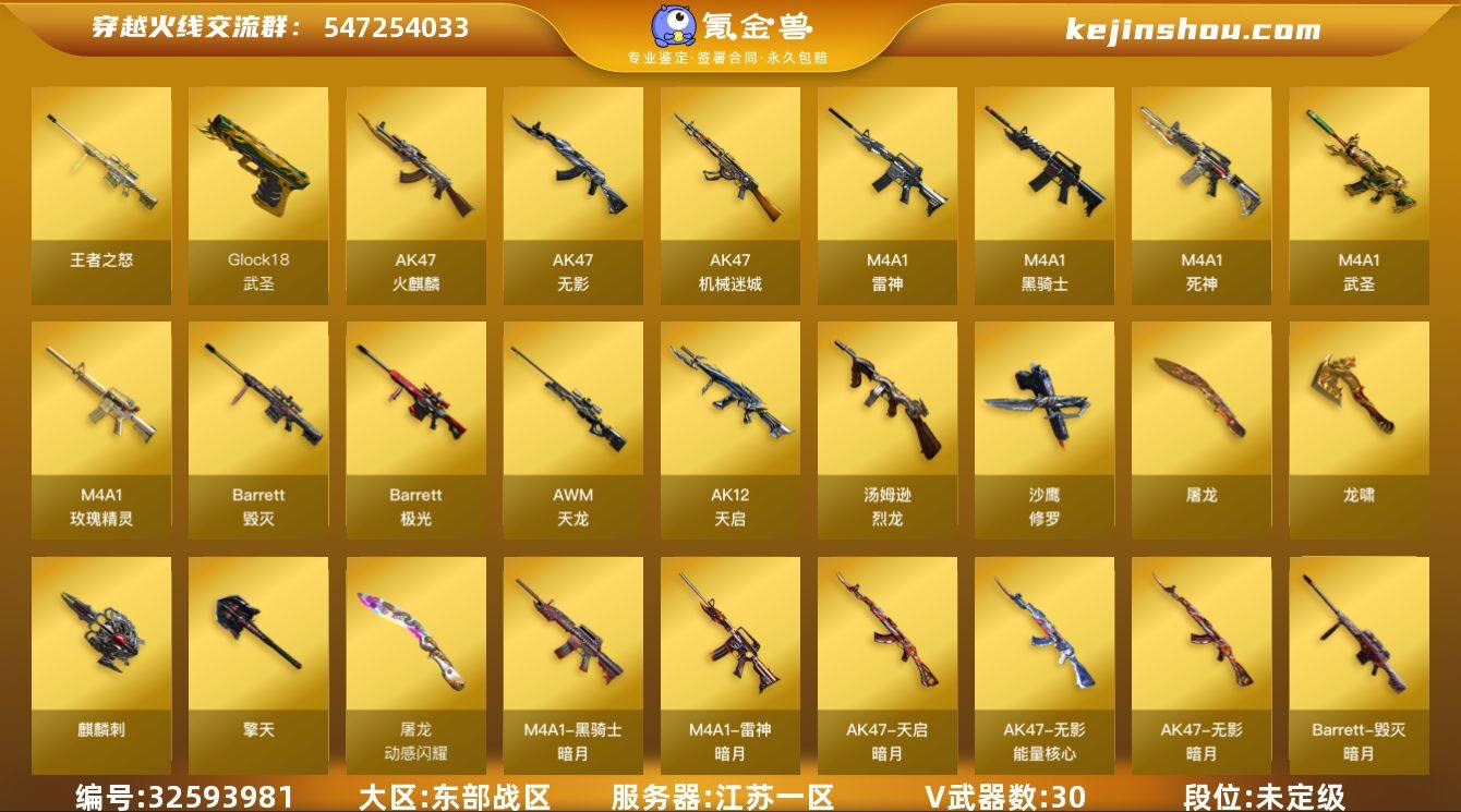 江苏一区-32V-1王者武器数-0炫金武器数 【热门武器】:死亡之眼*2,M4A1-黑骑士,汤姆逊-烈龙,沙鹰-修罗*6 【王者炫金武器】:王者之怒 【皮肤】:雷神-暗月,毁灭-暗月,黑骑士-暗月,无影-暗月,无影-能量核心,死神-秘银,天启-暗月,修罗-能量核心*2,天神-暗月 【角色】:零,瞳,乔伊教练,修道士,云海玲珑,风暴女,娟娟,铁骑荣耀 【暴走生化】:死亡之眼*2 【挑战大师】:激光毁灭者III-白马银枪 【英雄级武器】:AK47-火麒麟,M4A1-雷神,M4A1-黑骑士,AK47-无影*2,M4A1-死神,AK12-天启,M4A1-武圣,AK47-机械迷城,M4A1-玫瑰精灵,AWM-天龙,Barrett-毁灭,Barrett-极光,汤姆逊-烈龙,沙鹰-修罗*6,Glock18-武圣,屠龙*3,龙啸,擎天,麒麟刺*2,M4A1-苍鸣雷神 【道具】:女皇终结者-背包,战舰背包,机械魔影背包-红色,炫彩背包,女皇终结者-魔龙之吻,绿色巨人,灵魂忍者,迷雾幽灵,夺命之镰,防化服*3,流光-鎏金之域,枪王排位29赛季金色流光,防弹头盔*3,防弹衣*3,C4工具钳*3,手雷包*3 【特殊枪械】:1黑骑士,1烈龙