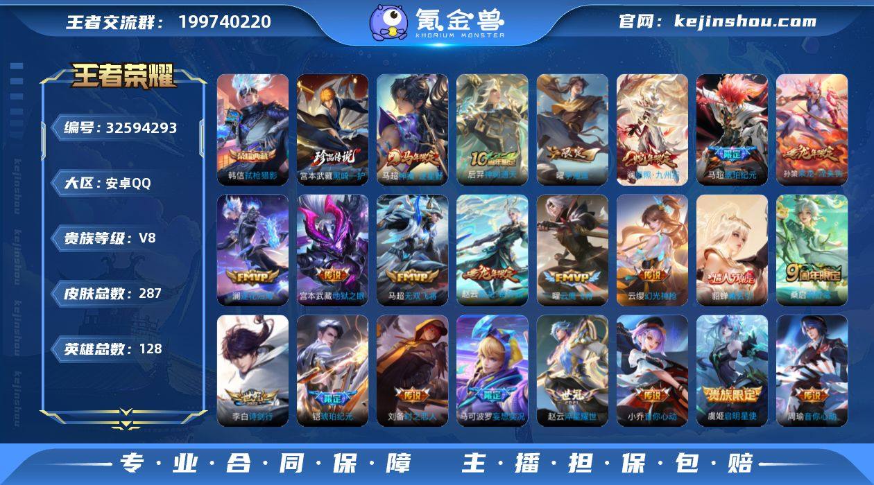 账号亮点:马超全皮,澜全皮 韩信弑枪猎影 宫本武藏黑崎一护 马超神骥逐星野,后羿神树通天,澜愿照九州拓,云缨幻光神枪,桑启鸣野蒿,貂蝉曦玄引,孙策乘龙淬吴钩,赵云乘龙铭钟鼎,马超琥珀纪元,铠琥珀纪元,澜逐花归海,马可波罗妄想实况,澜电玩雷克斯,李白诗剑行,马超无双飞将,赵云淬星耀世,曜李逍遥 ,周瑜音你心动,小乔音你心动,虞姬启明星使,曜云鹰飞将,刘备时之恋人,宫本武藏地狱之眼653-5 【英雄全皮】:孙权全皮,马超全皮,澜全皮 【荣耀典藏】:韩信弑枪猎影 【珍品传说】:宫本武藏黑崎一护 【传说皮肤】:马超神骥逐星野,后羿神树通天,澜愿照九州拓,云缨幻光神枪,桑启鸣野蒿,貂蝉曦玄引,孙策乘龙淬吴钩,赵云乘龙铭钟鼎,马超琥珀纪元,铠琥珀纪元,澜逐花归海,马可波罗妄想实况,澜电玩雷克斯,李白诗剑行,马超无双飞将,赵云淬星耀世,曜李逍遥 ,周瑜音你心动,小乔音你心动,虞姬启明星使,曜云鹰飞将,刘备时之恋人,宫本武藏地狱之眼 【限定皮肤】:暃埋骨钱,大乔绒语心约,姜子牙天穹之誓,杨戬破阵退雄兵,狄仁杰阴阳师,赵云皇家上将,嬴政白昼王子,阿轲迷踪丽影,元歌无心,马可波罗山海玄木吟,马可波罗妄想实况,狄仁杰魔术...