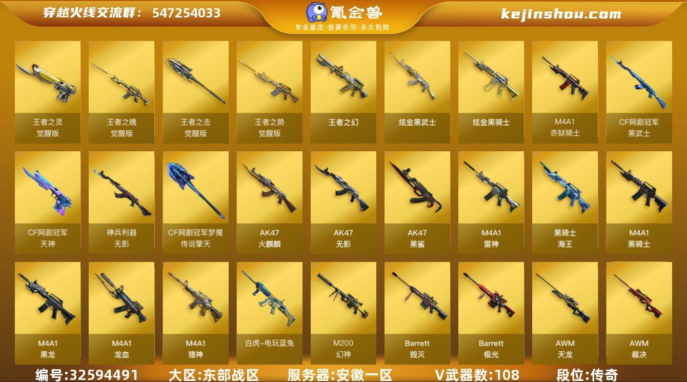 【ky6148】安徽一区-120V-6王者武器数-2炫金武器数 【热门武器】:QBZ03-金色蔷薇,HK417-朱雀,M200-幻神,M200-竞技荣光,死亡之眼,白虎-电玩蓝兔,柯尔特-冠军之特,C.A.T,M4A1-黑骑士,汤姆逊-烈龙*6,加特林-炼狱,斯泰尔-蝴蝶,降世魔童,裁决-雪莉杨,火麒麟-绝迹,USP-雷暴,沙鹰-修罗*3,Knife-冠军之刃 【王者炫金武器】:王者之幻,炫金骑士,炫金武士 【音效卡】:M200-幻神音效卡,M4A1-雷神音效卡,M4A1-黑龙音效卡,Barrett-毁灭音效卡,Barrett-碧霄极光音效卡 【皮肤】:幻神-周瑜皮肤,幻神-降龙,QBZ03-冠军之薇,雷神-暗月,雷神-荣耀之魄,雷神-冠军之魄,雷神-宠儿-2019MVP,火麒麟-雷神,火麒麟-轻羽皮肤,火麒麟-战神关羽,火麒麟-心动糖果,毁灭-星空,M4A1-千变-孔明皮肤,黑龙-暗月,黑骑士-冠军之势,战神-粉色甜心皮肤*4,战神-紫绶金章皮肤*7,战神-流金岁月皮肤*4,AK47-B-常胜将军-孙权,AWM-天龙-传奇白鲨,极光-能量核心,屠龙-荣耀之锋,麒麟刺-甜蜜糖果 皮肤 【角色】:魅影,迷迭香,电竞教官-云悠悠,关小雨,智,零·纪元,战地猎狐,王者-瞳-闭月羞花,王者影豹,空,暗夜-X,初恋灵狐,芳心审判者,风暴女*2,嘉年华灵狐,兰妹妹,...