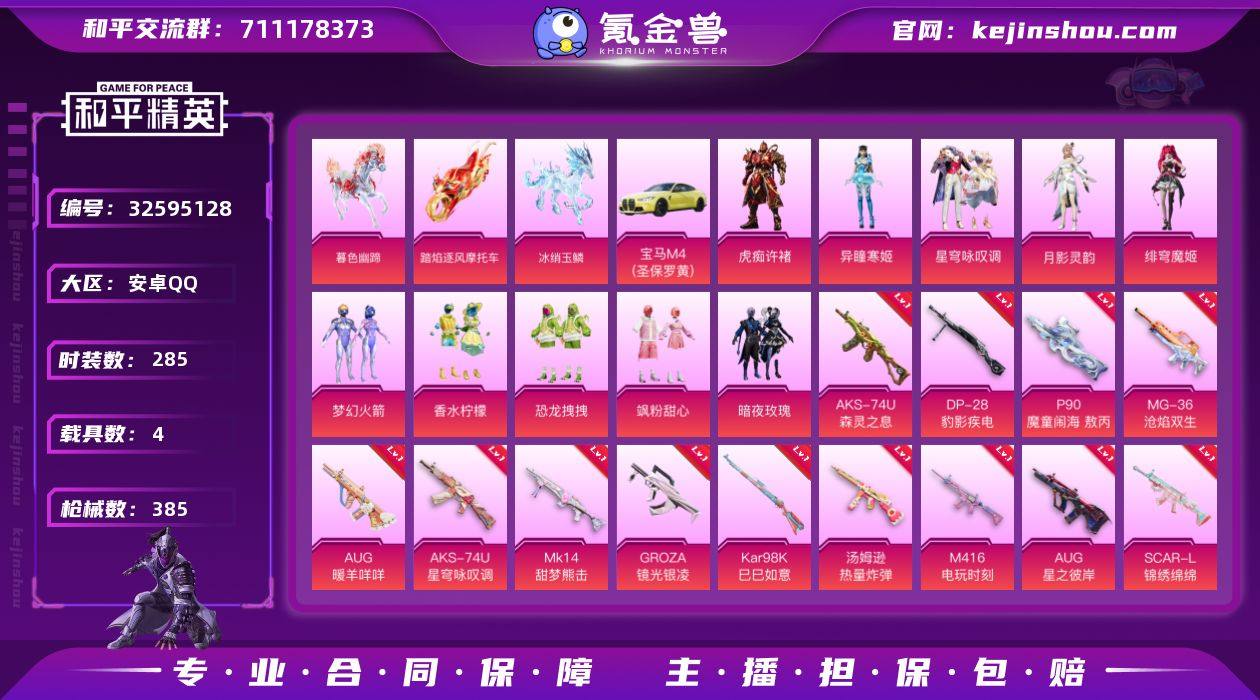 【15特效枪10粉装4载具 秒换绑不用等】 安卓Q区-127883热力值-285套装-385枪皮 【4载具】 暮色幽蹄 宝马M4(圣保罗黄) 冰绡玉鳞 踏焰逐风摩托车【2稀有】 奇异狩猎者 AWM-黄金龙骨【10粉装】 梦幻火箭 香水柠檬 恐龙拽拽 暗夜玫瑰 虎痴许褚 飒粉甜心 角色-异瞳寒姬 角色-月影灵韵 角色-绯穹魔姬 星穹咏叹调【15特效枪】 AKS-74U-森灵之息(4级) Mk14-福马献瑞(5级) ACE32-萌骑漫游(4级) SCAR-L-锦绣绵绵(5级) AUG-星之彼岸(7级) 汤姆逊-热量炸弹(5级) Kar98K-巳巳如意(5级) AKS-74U-星穹咏叹调(7级) Mk14-甜梦熊击(5级) AUG-暖羊咩咩(5级) M416-电玩时刻(5级) GROZA-镜光银凌(5级) DP-28-豹影疾电(5级) P90-魔童闹海 敖丙(3级) MG-36-沧焰双生(5级)【328热门】 雪山精英(老6服) 军刀雅典娜 极速红龙 团圆交子 瑞龙福将 忍者信条 冰川格斗者 白色伏地魔 SS9特训 SS8特训 SS6特训 SS3特训 SS2特训 SS27特训 SS26特训 SS25特训 SS24特训 SS23特训 SS22特训 SS10特训 S12K-华贵君王 Mini14-梦幻火箭 M762-乌木金纹 M24-妙趣可丽 AWM-不夜海上花 AWM-飒粉甜心 M416-乌木金纹 GROZA-乌木金纹 SCAR-L-玉兔迎春 GROZA-田园牧歌 AUG-幻影战神 M762-天降萌叽 Mk47-乌木金纹 UZI-娇憨猪猪 M...