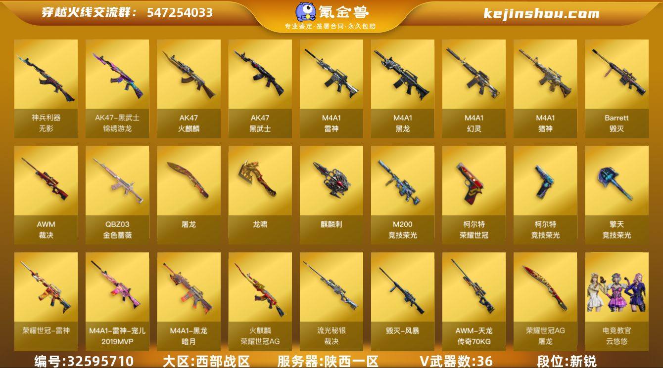【ky5689】陕西一区-37V-0王者-0炫金 【热门武器】:QBZ03-金色蔷薇,M200-竞技荣光,荣耀世冠-雷神,荣耀世冠-柯尔特,牛牛-AK47,USP-雷暴 【音效卡】:Barrett-毁灭音效卡 【皮肤】:裁决-流光秘银,雷神-宠儿-2019MVP,火麒麟-荣耀世冠AG,毁灭-风暴,黑龙-暗月,AWM-天龙-传奇70KG,屠龙-荣耀世冠AG 【角色】:电竞教官-云悠悠,修道士,暗夜-X,飞虎队-X,嘉年华灵狐,龙儿,龙儿-小淘气,萌儿,蜀雪,樱-战斗天使,游珑儿 【人偶武器】:AWM-灵狐-15周年嘉年华*2,牛牛-AK47,迷你牛牛,灵狐娃娃手雷 【挑战大师】:冰龙粉碎者-白马银枪 【英雄级武器】:AK47-火麒麟,M4A1-黑龙,M4A1-雷神,AK47-黑武士,M4A1-幻灵,无影-神兵利器,黑武士-锦绣游龙,QBZ03-金色蔷薇,M4A1-猎神,荣耀世冠-雷神,Barrett-毁灭,AWM-裁决,M200-竞技荣光,USP-雷暴,荣耀世冠-柯尔特,柯尔特-竞技荣光,屠龙*2,龙啸,马来剑-夜魔,麒麟刺,擎天-竞技荣光,高爆手雷-雷暴,高爆手雷-夜魔,高爆手雷-竞技荣光*4,闪光弹-雷霆,闪光弹-雷暴,闪光弹-夜魔,闪光弹-竞技荣光,烟雾弹-夜魔,烟雾弹-竞技荣光*3 【道具】:Q9战队炫彩背包,亚洲杯纪念炫彩背包,冰冰企鹅背包,超级背包,绿色...