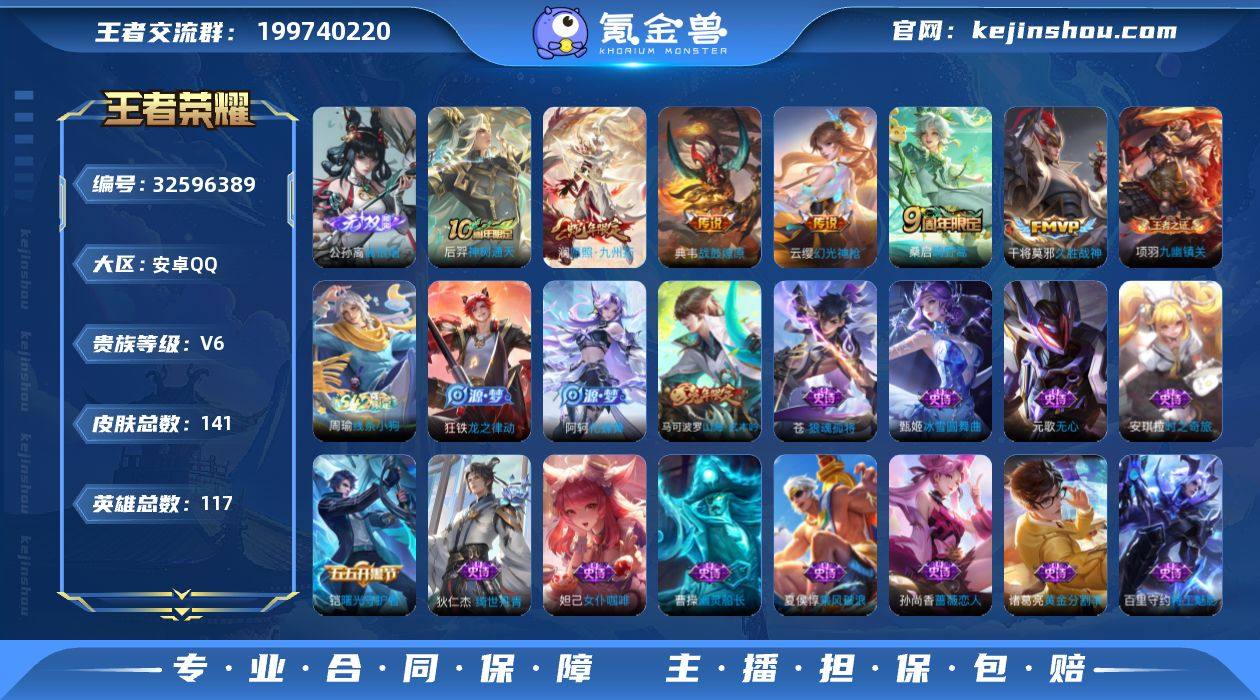 BHC60469 离恨烟 安卓Q-V6-最强王者段位-117英雄-141皮肤-1无双-6传说-32史诗 【英雄全皮】:苍全皮 【无双皮肤】:公孙离离恨烟 【传说皮肤】:后羿神树通天,澜愿照九州拓,云缨幻光神枪,桑启鸣野蒿,典韦战鼓燎原,干将莫邪久胜战神 【限定皮肤】:公孙离离恨烟,蒙犽顽岩魄,姜子牙天穹之誓,狄仁杰阴阳师,赵云皇家上将,孙尚香蔷薇恋人,元歌无心,马可波罗山海玄木吟,狄仁杰魔术师,达摩沙漠行僧,项羽海滩派对,兰陵王金庭之子,钟馗驱傩正仪,张良古海寻踪,鬼谷子天穹祈灯,沈梦溪龙舞盛年,刘邦剑破天穹,程咬金群星魔术团,刘备异域游侠,周瑜熔金海岸 【年限皮肤】:马可波罗山海玄木吟,澜愿照九州拓 【赛季限定】:钟馗驱傩正仪,达摩沙漠行僧,兰陵王金庭之子,张良古海寻踪,鬼谷子天穹祈灯,刘邦剑破天穹,姜子牙天穹之誓,东皇太一噬灭天穹,太乙真人谧流熔炉,钟馗虚灵犬护,亚瑟荣光之誓,牛魔星界战将,项羽九幽镇关 【战令限定】:孙膑茶境仙,马超访茗客,周瑜线条小狗 【史诗皮肤】:周瑜线条小狗,项羽九幽镇关,狂铁龙之律动,阿轲化蝶舞,狄仁杰绮世丹青,苍狼魂孤将,孙膑茶境仙,牛魔星界战将,蒙犽顽岩魄,马可波罗山海玄木吟,元歌无心,...