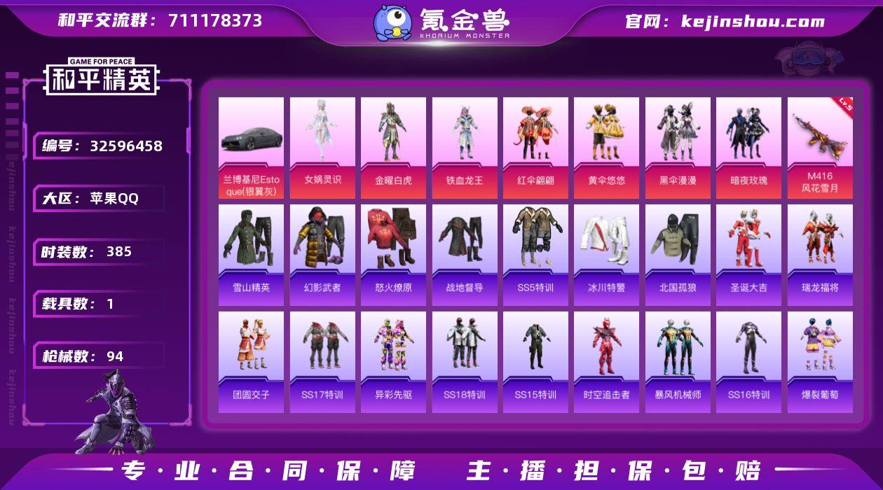 1载具-81套装-94枪皮-1载具7粉装1特效枪8热门81套装94枪皮 29217热力值 2印记 历史超级王牌4星 【1载具】 兰博轿车灰色 【7粉装】 女娲灵识 金曜白虎 铁血龙王 暗夜玫瑰 红伞翩翩 黄伞悠悠 黑伞漫漫 【1特效枪】 M416-风花雪月 (5级) 【8热门】 雪山精英 鹰眼刺客 迅捷狂鲨 团圆交子 瑞龙福将 破蛋小黄鸡 M416-魔法学院 M762-瑞龙福将 【1头盔】 银河战甲头盔 【3背包】 火曜朱雀背包 金曜白虎背包 神秘黑猫背包 营地ID: