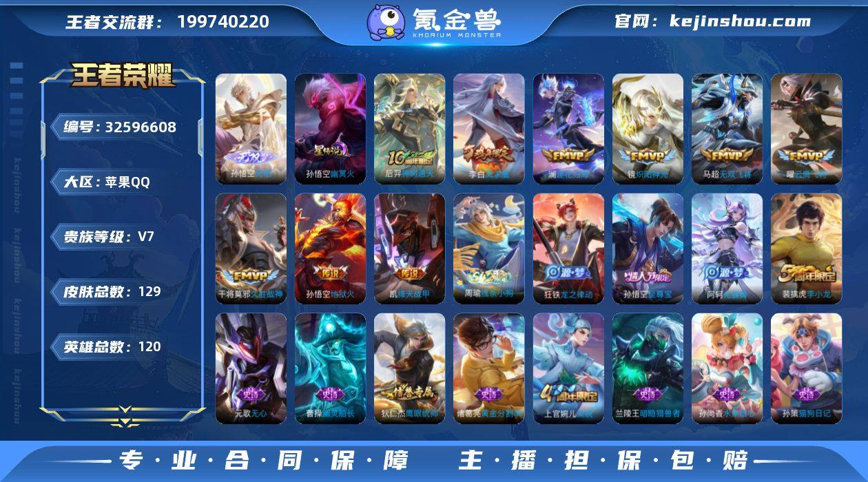 苹果Q-V7-最强王者段位-120英雄-129皮肤-2无双-1珍品传说-11传说-24史诗【无双皮肤】:李信问心剑,孙悟空无相【珍品传说】:伽罗沧流箭【传说皮肤】:云缨神骥越千峰,狄仁杰神骥赴朔漠,后羿神树通天,澜逐花归海,马超无双飞将,铠绛天战甲,镜炽阳神光,曜云鹰飞将,干将莫邪久胜战神,李白凤求凰,孙悟空地狱火【限定皮肤】:狄仁杰阴阳师,赵云皇家上将,鲁班七号狮舞东方,元歌无心,夏侯惇朔风刀,典韦穷奇,狄仁杰魔术师,狄仁杰万华元夜,项羽海滩派对,老夫子醍醐杖,程咬金演武夺筹,孙悟空至尊宝,牛魔御旌,钟馗神迹守卫,鬼谷子原初探秘者,弈星混沌棋,明世隐疑决卦,裴擒虎李小龙,狂铁御狮,米莱狄御霄,盾山御銮,上官婉儿梁祝【年限皮肤】:李白凤求凰【赛季限定】:典韦穷奇,狂铁御狮,米莱狄御霄,牛魔御旌,盾山御銮,夏侯惇朔风刀,弈星混沌棋,明世隐疑决卦,老夫子醍醐杖,鬼谷子原初探秘者,狄仁杰万华元夜,程咬金演武夺筹,太乙真人谧流熔炉,钟馗虚灵犬护,甄姬逆浪荇歌【战令限定】:鲁班七号狮舞东方,钟馗神迹守卫,周瑜线条小狗【史诗皮肤】:上官婉儿春霖将至,周瑜线条小狗,狂铁龙之律动,阿轲化蝶舞,元歌无心,裴擒虎李小龙,上官婉...