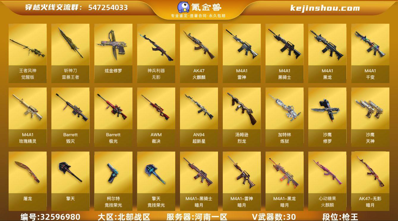 【ky6256】河南一区-35V-5王者武器数-2炫金武器数 【热门武器】:死亡之眼*3,M4A1-黑骑士,汤姆逊-烈龙,加特林-炼狱,沙鹰-修罗 【王者炫金武器】:斩神刀-雷暴王者,炫金修罗*2 【皮肤】:裁决-星际旅行 皮肤,雷神-暗月,火麒麟-心动糖果,毁灭-暗月,黑龙-暗月,黑骑士-暗月,无影-暗月,极光-能量核心,修罗-能量核心,天神-暗月 【角色】:葵,樱,电竞教官-云悠悠,风暴女,虎妞,嘉年华灵狐,兰-新年限定,0号玩家,斯沃特-X,铁骑荣耀,兔囡囡,樱-战斗天使 【人偶武器】:AWM-灵狐-15周年嘉年华,迷你波特博士,生化手雷-机甲核心,深渊终结者手雷 【暴走生化】:死亡之眼*3,超级对讲机 【挑战大师】:冰龙粉碎者-白马银枪,激光毁灭者III-白马银枪,神圣爆裂者-末日III*3 【英雄级武器】:M4A1-千变,AK47-火麒麟*2,M4A1-黑龙,M4A1-雷神,M4A1-黑骑士,AN94-超新星,无影-神兵利器,M4A1-玫瑰精灵,天罚-斗烈龙驹,Barrett-毁灭,Barrett-极光,AWM-裁决,Barrett-金色蔷薇,王者风神-觉醒版,加特林-炼狱,汤姆逊-烈龙,沙鹰-修罗,沙鹰-天神*2,柯尔特-竞技荣光,屠龙*2,擎天,擎天-竞技荣光,屠龙-斗烈龙驹,高爆手雷-竞技荣光,高爆手雷-雷暴王者,闪光弹...