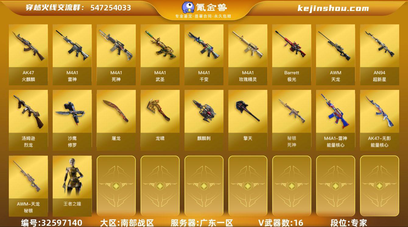 【ky6259】广东一区-16V-0王者武器数-0炫金武器数 【热门武器】:死亡之眼,汤姆逊-烈龙,沙鹰-修罗 【皮肤】:雷神-能量核心,无影-能量核心,死神-秘银,天龙-秘银,天神-暗月*2 【角色】:王者之瞳 【暴走生化】:死亡之眼 【英雄级武器】:M4A1-千变,AK47-火麒麟*2,M4A1-雷神,M4A1-死神,AN94-超新星,M4A1-武圣,M4A1-玫瑰精灵,AWM-天龙,Barrett-极光,汤姆逊-烈龙,沙鹰-修罗,屠龙,龙啸,擎天,麒麟刺 【源级武器】:源·火麒麟,源·雷神,源·天龙 【道具】:战舰背包,夺命之镰,防化服,防弹头盔,防弹衣,C4工具钳,手雷包 【特殊枪械】:1烈龙