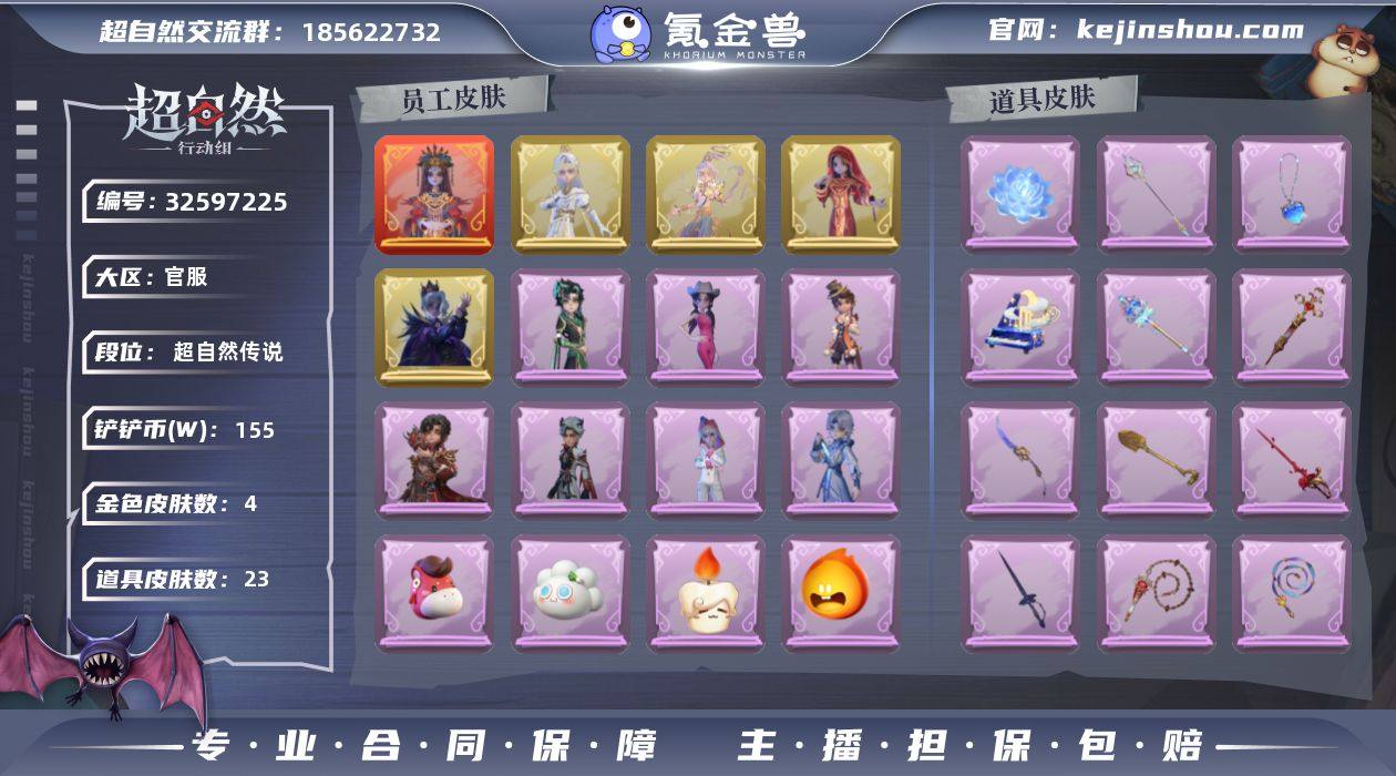 【账号已绑定信息】:邮箱 【幻梦皮肤】:巫铃儿-镜生遗梦 【耀世皮肤】:逍遥-莲华渡,逍遥-剑仙,零-渡鸦公爵,巫铃儿-镜花辞 【典藏皮肤】:爱丽丝-耀眼的你,零-磨砺成锋,零-搬开山,零-青云逸歌,阿念-庆宴绮愿,艾伦-绒绒对决,艾伦-黎明猎手 【道具皮肤】:铲子-龙鳞,传送按钮-逆时审判,传送按钮-昆仑镜,桃木剑-永眠曲,桃木剑-绯色遗证,腰包-月下莲台,腰包-红运福虎,额外的背包-飞花令,长枪-波塞冬,长鞭-飞天绫,长鞭-缚誓之锁,摸金符-海洋之心,葫芦-伏妖塔,黄牛能量饮料-珍珠芭乐莓莓,黄牛能量饮料-青玉抱丹,夜视仪-金丝眼镜,音响-月光奏鸣曲,音响-happy猫,刺刀-紫气东来,荧光棒-桃心,电击枪-权杖的许诺,除颤仪-冰晶般的代价,急救包-末章心跳 【金色动作】:新年摇,打车摇,鹏友摇,鸳鸯戏,孤身摇,舞台中心,胜利之舞 【紫色动作】:豪华定制烟花,拜年,蝴蝶步,举牌,抬手 【头饰】:马上有钱,饺饺者头套,蒜了八,烛光纪念,火爆了头套,鱼头怪头套,烈焰红唇头套,面具马头套,哈士奇头套,萨卡班甲鱼头套,卑微头套,呆滞头套,滑稽头套,嘻嘻头套 【背饰】:夜浮船,梵音莲华,牛啤背包,蝶恋花,子夜证词 【挂饰】:拂云仙,孤独对...