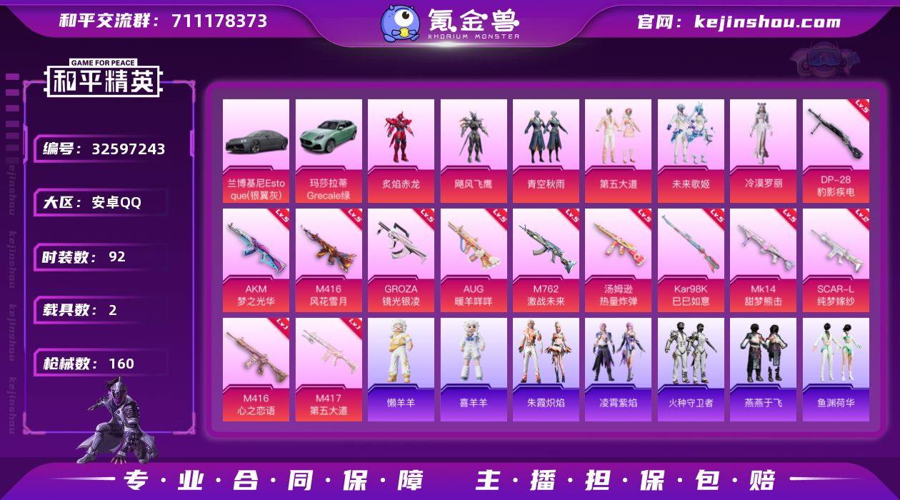 【kyhp641】安卓 手Q-6粉装-13特效枪-2载具-1粉色飞行器-48479热力值-4王牌印记-92套装-160枪皮 【粉色套装】:粉装-炙焰赤龙,粉装-飓风飞鹰,粉装-青空秋雨,粉装-第五大道,粉装-未来歌姬,角色-冷漠罗丽 【粉色枪皮等级】:AKM-梦之光华(五级),SCAR-L-纯梦嫁纱(二级),M416-心之恋语(一级),M416-风花雪月(五级),GROZA-镜光银凌(五级),AUG-暖羊咩咩(五级),M762-激战未来(五级),汤姆逊-热量炸弹(五级),Kar98K-巳巳如意(五级),Mk14-甜梦熊击(五级),M417-第五大道(一级),DP-28-豹影疾电(五级) 【粉色载具】:兰博基尼Estoque(银翼灰),玛莎拉蒂Grecale(薄荷绿) 【粉色枪皮】:AKM-梦之光华,SCAR-L-纯梦嫁纱,M416-心之恋语,M416-风花雪月,GROZA-镜光银凌,AUG-暖羊咩咩,M762-激战未来,汤姆逊-热量炸弹,Kar98K-巳巳如意,Mk14-甜梦熊击,Mk14-福马献瑞,M417-第五大道,DP-28-豹影疾电 【粉色飞行器】:英伦信使飞行器 【粉色降落伞】:炫紫旋律降落伞,风花雪月降落伞,焦糖拿铁降落伞,旋转彩虹降落伞,暗夜鎏金降落伞,音爆索尼克降落伞,第五大道降落伞,雪梅暗香降落伞,纯梦嫁纱降落伞,精灵梦叶罗丽降落伞,金丰海韵降落伞 【稀有套装】:套装-马上...