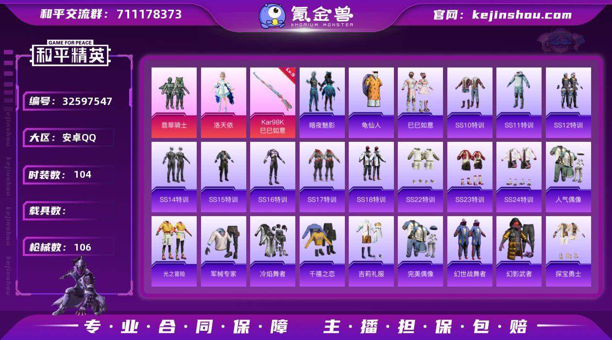 安卓 手Q-2粉装-1特效枪-0载具-1粉色飞行器-34916热力值-4王牌印记-104套装-106枪皮 【热门品类】:套装-龟仙人 【粉色套装】:粉装-翡翠骑士,角色-洛天依 【粉色枪皮等级】:Kar98K-巳巳如意(五级) 【粉色枪皮】:Kar98K-巳巳如意 【粉色飞行器】:齐天大圣飞行器 【粉色降落伞】:百万伏特降落伞,精灵迷巫降落伞,PEL轰鸣竞梦者降落伞,锦绣火鲤降落伞,激战未来降落伞,银刃赛罗降落伞,童趣迷兔降落伞,星之彼岸降落伞,暗夜玫瑰降落伞,鬼刀降落伞,炫彩糖果降落伞 【稀有套装】:套装-龟仙人,套装-巳巳如意,套装-迅捷龙虾 【稀有枪皮】:AKM-夜灯,AKM-灼热熔岩,AKM-生命誓言,AKM-萌趣颜团子,AKM-虎虎生威,M16A4-蓝色火焰,SCAR-L-炫彩节奏,SCAR-L-繁花小夜曲,M416-滑板小狐,M416-蓝色火焰,GROZA-彩虹符号,GROZA-梨园星光,GROZA-治愈之星,GROZA-生命誓言,GROZA-马卡龙,AUG-天降萌叽,AUG-炫光贝贝,AUG-耀粉歌者,AUG-青春冒险家,QBZ-彩虹符号,M762-天降萌叽,M762-牛气冲天,M762-瑞龙福将,Mk47-青春冒险家,G36C-时空追击者,G36C-暗夜玫瑰,AC-VAL-天降萌叽,蜜獾-天降萌叽,UZI-天降萌叽,UZI-红色方程式,UMP45-时空追击者,UMP45-涂山之恋,U...