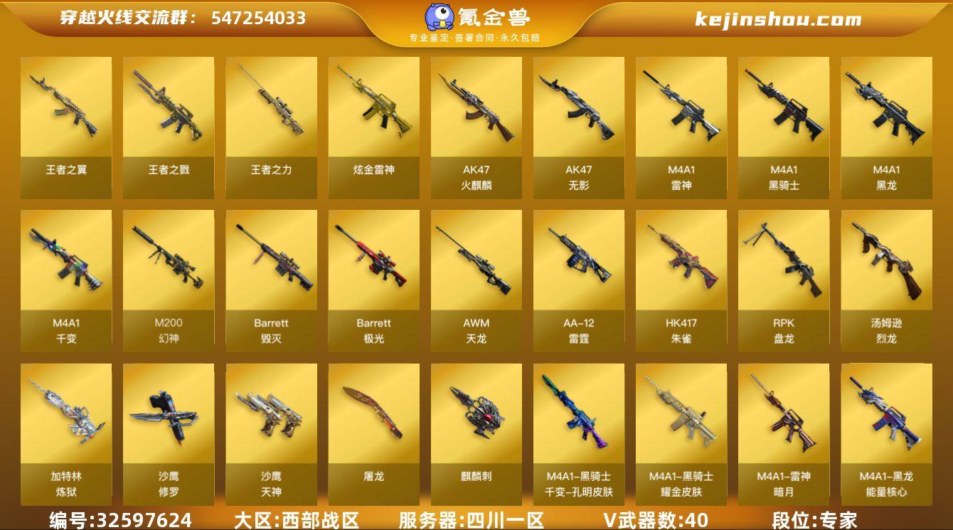 【ky6317】四川一区-41V-3王者武器数-1炫金武器数 【热门武器】:HK417-朱雀,M200-幻神,M4A1-黑骑士,汤姆逊-烈龙*2,RPK-盘龙*3,加特林-炼狱*2,沙鹰-修罗*4 【王者炫金武器】:王者之戮,王者之翼,王者之力,炫金雷神 【音效卡】:M4A1-黑龙音效卡,M4A1-黑骑士音效卡,Barrett-毁灭音效卡,Barrett-极光音效卡 【皮肤】:雷神-暗月,毁灭耀金皮肤,M4A1-千变-孔明皮肤,黑龙-能量核心,黑骑士耀金皮肤,无影-能量核心,极光-能量核心,修罗-星空 【角色】:魅影 【挑战大师】:神圣爆裂者III 【英雄级武器】:M4A1-千变*2,AK47-火麒麟*3,M4A1-黑龙*3,M4A1-雷神,M4A1-黑骑士,AK47-无影,HK417-朱雀,AWM-天龙,Barrett-毁灭*2,Barrett-极光*2,M200-幻神,RPK-盘龙*3,加特林-炼狱*2,汤姆逊-烈龙*2,AA-12-雷霆,沙鹰-修罗*4,沙鹰-天神*2,屠龙*5,麒麟刺*3 【源级武器】:M4A1-十二生肖·龙-雷神,雷神-赛博朋克,魂·黑骑士-娜塔莉娅,御·黑骑士·哪吒闹海,源·武圣,源·机械迷城,魂·龙血-锋芒破茧,魂·炼狱-电子连击*2,源·武圣glock 【道具】:炫彩背包,夺命之镰,防化服,金色流光-枪王排位,星辰流光-枪王排位,枪王排位29赛季金色流光,防弹头盔,防弹衣...