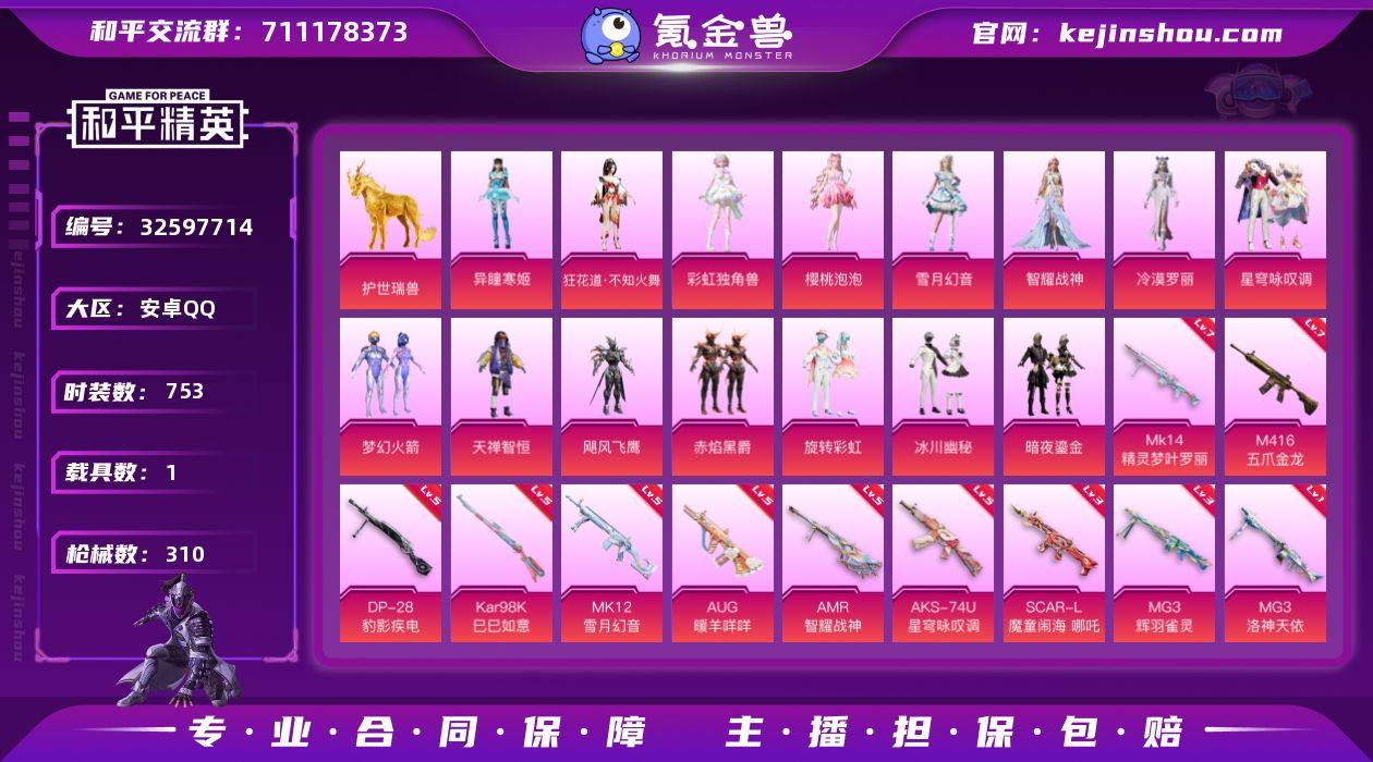 1载具-203套装-310枪皮-1载具16粉装13特效枪13热门203套装310枪皮 热力值 9印记 历史超级王牌12星 【1载具】 护世瑞兽 【15粉装】 梦幻火箭 狂花道·不知火舞 雪月幻音 异瞳寒姬 彩虹独角兽 樱桃泡泡 星穹咏叹调 冷漠罗丽 智耀战神 天禅智恒 冰川幽秘 暗夜鎏金 飓风飞鹰 旋转彩虹 赤焰黑爵 【14特效枪】 M416-五爪金龙 (7级) SCAR-L-魔童闹海哪吒 (3级) AKS-74U-森灵之息 (5级) AKS-74U-星穹咏叹调 (5级) Kar98K-巳巳如意 (5级) MG3-辉羽雀灵 (3级) DP-28-豹影疾电 (5级) AUG-暖羊咩咩 (5级) Mk14-精灵梦叶罗丽 (7级) MK12-雪月幻音 (5级) AMR-智耀战神 (5级) MG3-洛神天依 (1级) AKS-74U-森灵之息 (5级) Mk14-福马献瑞 (5级) 【13热门】 龟仙人 万圣娃娃 暗夜行者 诡面顽熊 团圆交子 瑞龙福将 粉红小猪 破蛋小黄鸡 极速红龙 军刀雅典娜 英勇保护者 Kar98K-终极赛罗 M762-瑞龙福将 【3飞行器】 齐天大圣飞行器 太空嘟嘟飞行器 天之羽翼飞行器 【2背包】 幻影战神背包 深海小丑鱼背包 圣域龙宝僚机 营地ID: