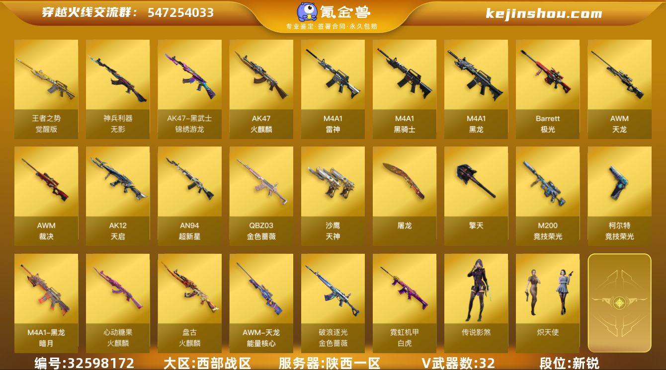 【ky5601】陕西一区-35V-2王者武器数-0炫金武器数 【传说角色】:传说影煞 【热门武器】:QBZ03-金色蔷薇,M200-竞技荣光,死亡之眼,M4A1-黑骑士,羊驼玩偶 【皮肤】:白虎-霓虹机甲 皮肤,金色蔷薇-破浪逐光 皮肤,火麒麟-盘古,火麒麟-心动糖果,黑龙-暗月,天龙-能量核心 【角色】:炽天使,暗夜-X,风暴女,虎妞,嘉年华灵狐,灵狐者-X,女主播,潘多拉-X,潜龙队-X,斯沃特-X 【人偶武器】:AWM-灵狐-15周年嘉年华,迷你波特博士,迷你生化手雷,生化手雷-机甲核心 【暴走生化】:死亡之眼,超级对讲机 【挑战大师】:激光毁灭者III-白马银枪,神圣爆裂者-末日III 【英雄级武器】:AK47-火麒麟,M4A1-黑龙,M4A1-雷神,M4A1-黑骑士,AK12-天启,AN94-超新星,QBZ03-天罚,无影-神兵利器,黑武士-锦绣游龙,QBZ03-金色蔷薇,王者之势-觉醒版,AWM-天龙,Barrett-极光,AWM-裁决,M200-竞技荣光,沙鹰-天神*3,柯尔特-竞技荣光,屠龙,擎天,高爆手雷-竞技荣光*3,高爆手雷-云龙*2,闪光弹-幻灵,闪光弹-竞技荣光*2,闪光弹-雷霆王者-觉醒版,烟雾弹-竞技荣光,烟雾弹-云龙 【道具】:BS战队炫彩背包,CFS限定背包,云山科技背包,全能枪王背包,女皇终结者-背包,炫彩背...