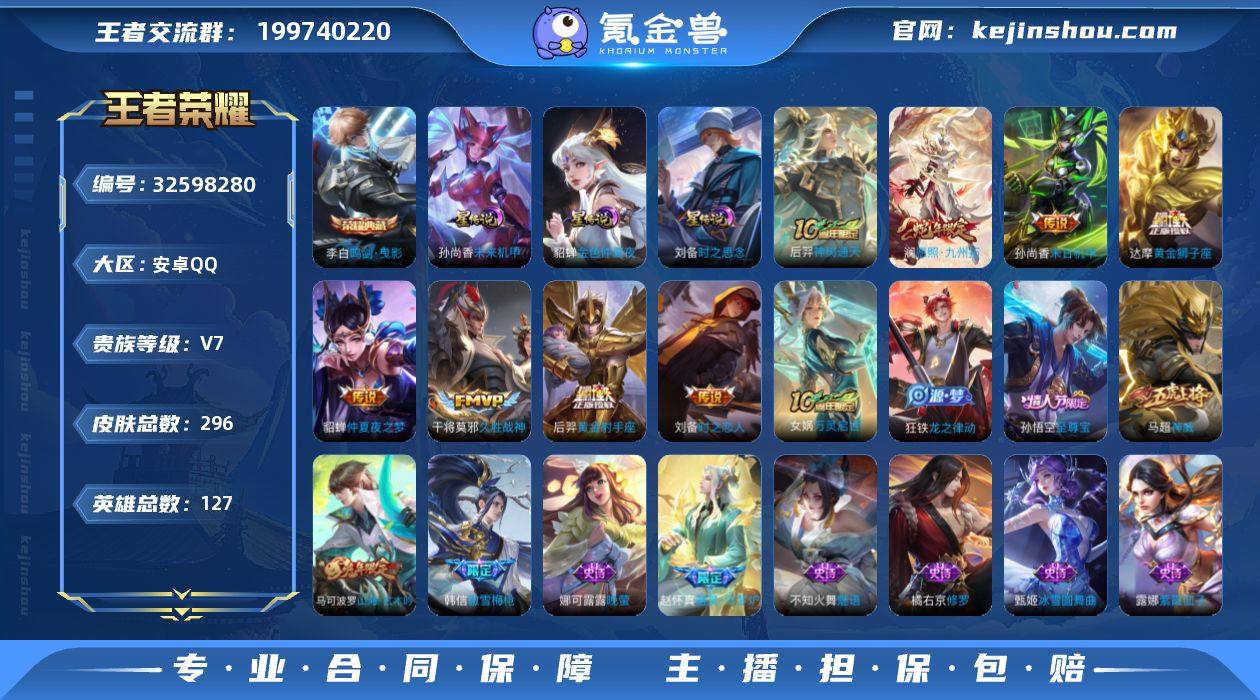 V7 1典藏 8传说 3星元 296皮肤 127英雄 【1水晶】李白-鸣剑·曳影【8传说】达摩-黄金狮子座,貂蝉-仲夏夜之梦,干将莫邪-久胜战神,后羿-黄金射手座,刘备-时之恋人,孙尚香-末日机甲,澜-愿照·九州拓,后羿-神树通天【3星元】刘备-时之思念,孙尚香-未来机甲,貂蝉-金色仲夏夜之梦【79史诗】元歌-无心,鬼谷子-五谷丰年,赵云-未来纪元,澜-赏金猎手,夏洛特-永昼,阿轲-暗夜猫娘,阿轲-节奏热浪,阿轲-迷踪丽影,安琪拉-心灵骇客,白起-星夜王子,百里守约-特工魅影,百里玄策-原初追逐者,不知火舞-魅语,蔡文姬-舞动绿茵,曹操-天狼征服者,嫦娥-拒霜思,程咬金-功夫厨神,妲己-女仆咖啡,妲己-魅力维加斯,狄仁杰-魔术师,狄仁杰-鹰眼统帅,貂蝉-圣诞恋歌,干将莫邪-真爱魔法,宫本武藏-鬼剑武藏,韩信-傲雪梅枪,花木兰-水晶猎龙者,橘右京-修罗,镜-匿光追影者,兰陵王-暗隐猎兽者,兰陵王-驯魔猎人,老夫子-航海奇遇记,李白-千年之狐,李元芳-逐浪之夏,李元芳-银河之约,刘邦-德古拉伯爵,刘禅-天才门将,露娜-紫霞仙子,鲁班七号-电玩小子,吕布-圣诞狂欢,吕布-末日机甲,马超-神威,墨子-金属风暴,娜可露露-晚萤,上官婉儿-梁祝,裴擒虎-李小龙,司马懿-暗渊魔法,孙策-猫狗日记,孙尚香-水果甜心,孙尚香-蔷薇恋人,孙悟空-...
