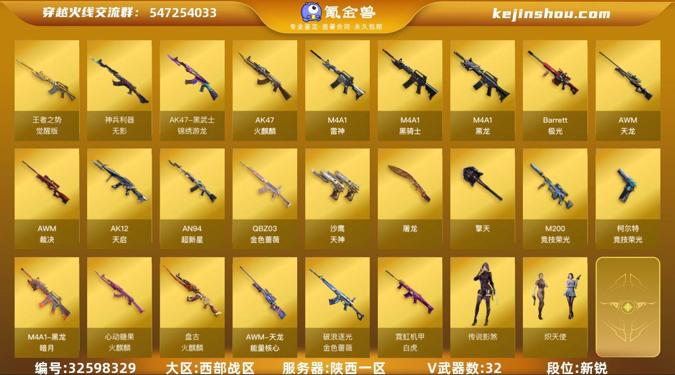 陕西一区-35V-2王者武器数-0炫金武器数 【传说角色】:传说影煞 【热门武器】:QBZ03-金色蔷薇,M200-竞技荣光,死亡之眼,M4A1-黑骑士,羊驼玩偶 【皮肤】:白虎-霓虹机甲 皮肤,金色蔷薇-破浪逐光 皮肤,火麒麟-盘古,火麒麟-心动糖果,黑龙-暗月,天龙-能量核心 【角色】:炽天使,暗夜-X,风暴女,虎妞,嘉年华灵狐,灵狐者-X,女主播,潘多拉-X,潜龙队-X,斯沃特-X 【人偶武器】:AWM-灵狐-15周年嘉年华,迷你波特博士,迷你生化手雷,生化手雷-机甲核心 【暴走生化】:死亡之眼,超级对讲机 【挑战大师】:激光毁灭者III-白马银枪,神圣爆裂者-末日III 【英雄级武器】:AK47-火麒麟,M4A1-黑龙,M4A1-雷神,M4A1-黑骑士,AK12-天启,AN94-超新星,QBZ03-天罚,无影-神兵利器,黑武士-锦绣游龙,QBZ03-金色蔷薇,王者之势-觉醒版,AWM-天龙,Barrett-极光,AWM-裁决,M200-竞技荣光,沙鹰-天神*3,柯尔特-竞技荣光,屠龙,擎天,高爆手雷-竞技荣光*3,高爆手雷-云龙*2,闪光弹-幻灵,闪光弹-竞技荣光*2,闪光弹-雷霆王者-觉醒版,烟雾弹-竞技荣光,烟雾弹-云龙 【道具】:BS战队炫彩背包,CFS限定背包,云山科技背包,全能枪王背包,女皇终结者-背包,炫彩背包,背包-洛...