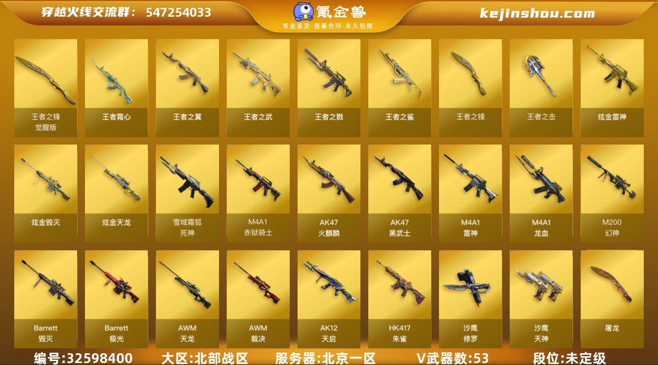 北京一区-56V-8王者武器数-11炫金武器数 【热门武器】:HK417-朱雀,M200-幻神,加特林-炼狱*4,沙鹰-修罗*4 【王者炫金武器】:王者之鲨,王者之戮,王者之翼,王者之武,王者霜心,王者之击,王者之锋*2,炫金骑士*4,炫金雷神,炫金毁灭,炫金天龙*5 【音效卡】:死神-雪域霜狐-怀旧音效卡 【皮肤】:幻神-AG-CFPL S24冠军 皮肤,裁决-典雅胡桃 皮肤,裁决-运输船 皮肤,雷神-宇航兔皮肤,火麒麟-巅峰荣耀,火麒麟-典雅胡桃 皮肤,毁灭耀金皮肤*3,毁灭-星空,毁灭-英雄计划 皮肤,无影耀金皮肤,AWM-天龙-传奇70KG,极光-能量核心,修罗-能量核心 【角色】:零,战地猎狐,雪域霜狐,乔伊教练,云海玲珑,娟娟,兰-海滩派对,零-水下丽影,灵狐者-X,灵狐者-黄金海岸,潘多拉-X,潘多拉-甜心教官,兔囡囡,影武者-X,海豹突击队 【人偶武器】:AK12-天启-骁智金戈,超新星-枪娘安琪儿,金色蔷薇-枪娘阿敏,迷你深渊冰龙,迷你生化手雷 【挑战大师】:神圣爆裂者III 【英雄级武器】:AK47-火麒麟*4,M4A1-雷神,AK47-黑武士*2,AK12-天启*5,M4A1-龙血*4,HK417-朱雀,死神-雪域霜狐,AWM-天龙*7,Barrett-毁灭,Barrett-极光,AWM-裁决,M200-幻神,加特林-炼狱*4,沙鹰-...