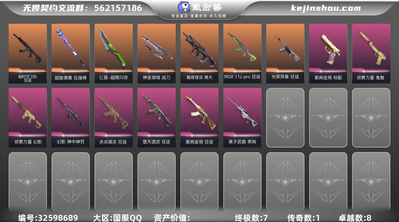 【NF242】【英雄】:幻棱,炼狱,维斯,暮蝶,钛狐,壹决,铁臂,捷风,雷兹,幽影,不死鸟,贤者,猎枭,蝰蛇,零,芮娜,奇乐,尚勃勒,霓虹,斯凯,夜露,星礈,K/O,海神,盖可,黑梦,钢锁 【近战武器】:近战武器-镭切,近战武器-超能偶像 应援棒,近战武器-超限闪存 匕首,近战武器-神圣领域 战刀 【狂徒】:狂徒-RGX 11z Pro,狂徒-光荣异象,狂徒-超时空卫队,狂徒-冰点凝冻,狂徒-堕天遗武,狂徒-紫阙金琅,狂徒-超能偶像 【幻影】:幻影-侦察力量,幻影-神中神罚,幻影-超限闪存,幻影-神圣领域,幻影-聚合之力 【戍卫】:戍卫-超能偶像,戍卫-浮光跃金,戍卫-月球哨兵 【獠犬】:獠犬-黯夜怪谈,獠犬-神圣领域,獠犬-采蜜小蜂队,獠犬-模拟赫兹 【冥驹】:冥驹-离子武器,冥驹-模拟赫兹,冥驹-星云暗涌 【飞将】:飞将-聚合之力 【莽侠】:莽侠-超限闪存,莽侠-月球哨兵 【战神】:战神-神圣领域,战神-采蜜小蜂队,战神-浮光跃金 【判官】:判官-超能偶像,判官-采蜜小蜂队 【雄鹿】:雄鹿-模拟赫兹,雄鹿-月球哨兵 【骇灵】:骇灵-浮光跃金,骇灵-星云暗涌 【蜂刺】:蜂刺-超限闪存,蜂刺-聚合之力,蜂刺-星云暗涌 【标配】:标配-紫阙金琅,标配-超能偶像,标...