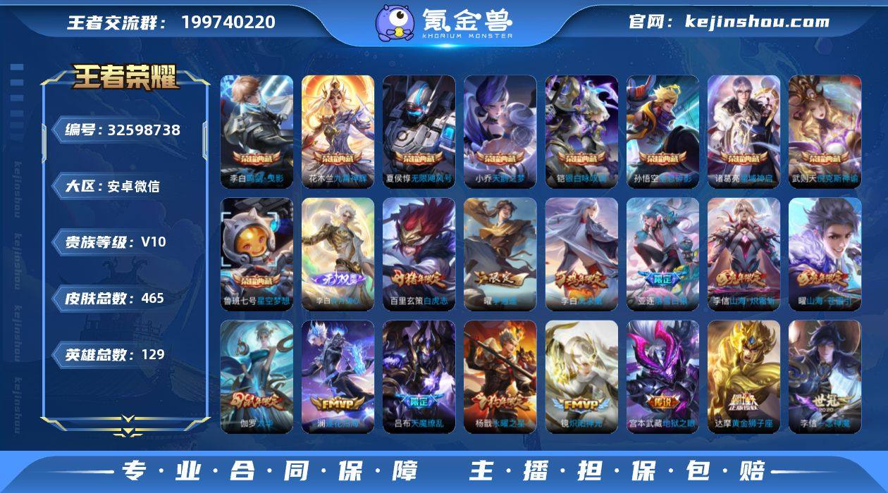 【店铺主推v10·金标曜·金标暃·金标镜·金标元歌·8个金标·10典藏·1无双·6星传说·55传说·2天幕·绝版梅西·倪克斯神谕·九霄神辉·鸣剑曳影·碎月剑心·秋月华灯天幕·落雪白狼·吕布曦玄引·貂蝉曦玄引·鹤羽星尊·山海苍雷引·孙尚香异界灵契·李逍遥·兰陵王默契交锋·时雨天司·武圣·白虎志·永曜之星·武陵仙君·天魔缭乱·凤求凰·神威·至尊宝·可二次】YXw15779-安卓WX-129英雄-465皮肤-28王者印记-300铭文-贵族积分32w【贵族10】【10典藏·1无双·6星传说·55传说·2天幕·17按键·8个性戳戳】【因赛季更新游戏段付以上号为准!】 【英雄全皮】:墨子全皮,扁鹊全皮,孙权全皮,猪八戒全皮,金蝉全皮,戈娅全皮,空空儿全皮,影全皮 【荣耀典藏】:武则天英雄,孙悟空全息碎影,武则天倪克斯神谕,夏侯惇无限飓风号,小乔天鹅之梦,鲁班七号星空梦想,李白鸣剑曳影,诸葛亮星域神启,花木兰九霄神辉,铠银白咏叹调 【无双皮肤】:李白碎月剑心 【金标】:金标曜,金标暃,金标赵怀真,金标雅典娜,金标诸葛亮,金标云缨,金标元歌,金标镜 【天幕】:秋月华灯天幕,共赏芳华天幕 【传说皮肤】:桑启鸣野蒿,墨子黄金天蝎座,海月金乌负日,亚连落雪白狼,吕布曦玄引,貂蝉曦玄引,澜逐花归海,艾琳觅芳...