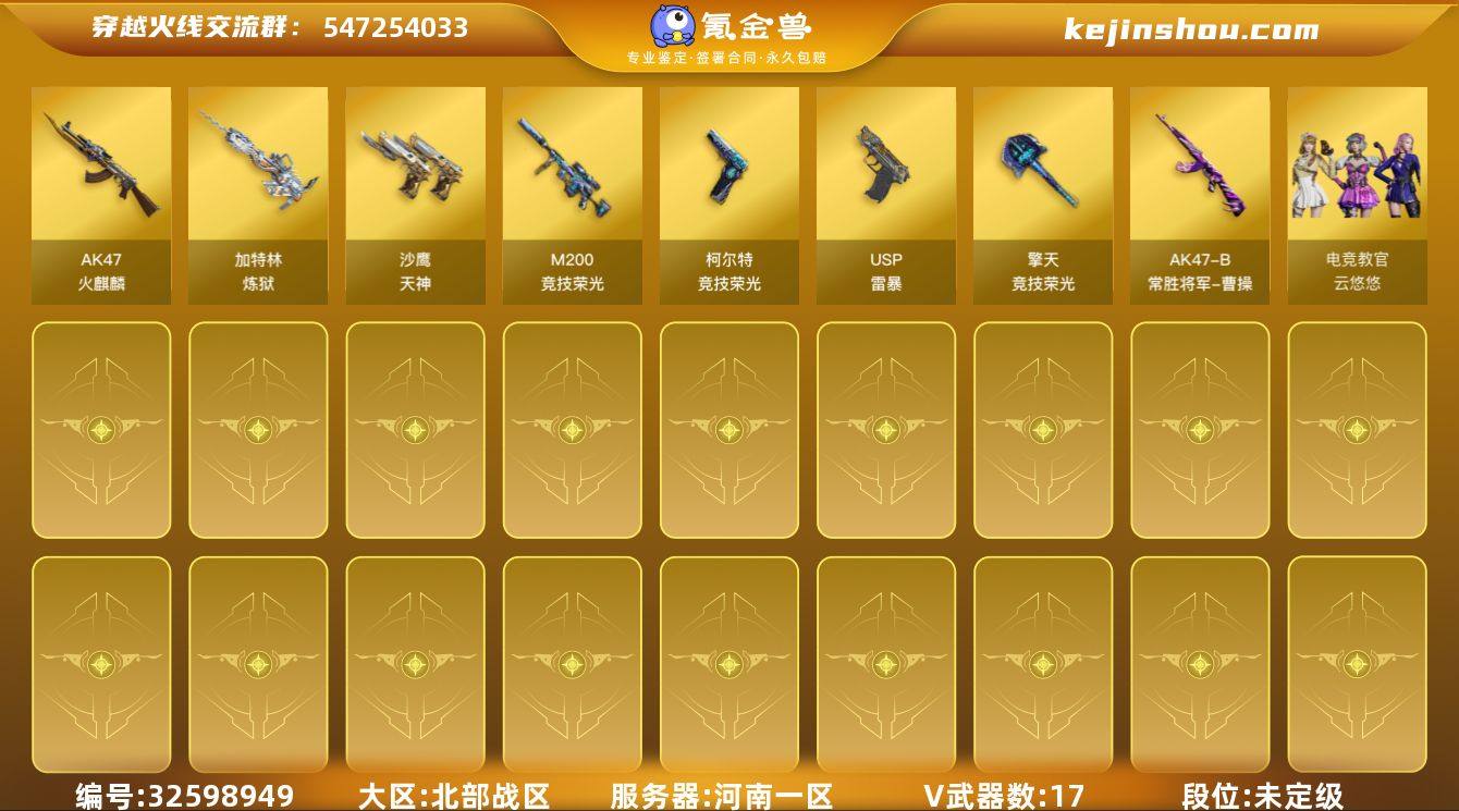 河南一区-19V-1王者-0炫金 【热门武器】:M200-竞技荣光,死亡之眼,加特林-炼狱,裁决-雪莉杨,USP-雷暴 【皮肤】:AK47-B-常胜将军-曹操 【角色】:电竞教官-云悠悠,战地猎狐,奇洋探员,乔伊教练,修道士,云海玲珑,暗夜-X,初恋灵狐,猎狐者-追月,流浪蔷薇,斯沃特-X,雪莉杨-摸金校尉,夜玫瑰-幻能朋克 【人偶武器】:裁决-雪莉杨,天龙-曼陀罗,夺魂,迷你生化手雷,迷你超能女侍 【暴走生化】:死亡之眼 【挑战大师】:冰龙粉碎者-白马银枪,激光毁灭者III-白马银枪,阐释者III 【英雄级武器】:AK47-火麒麟,M200-竞技荣光,王者星神-觉醒版,加特林-炼狱,沙鹰-天神,USP-雷暴,柯尔特-竞技荣光*2,擎天-竞技荣光,高爆手雷-竞技荣光,手雷-热带奇洋,闪光弹-竞技荣光*3,烟雾弹-竞技荣光*2,M4A1-赤狱骑士 【道具】:BS战队炫彩背包,奇洋探员-海龟背包,虎牙炫彩背包,超级背包,女皇终结者-魔龙之吻,救世主-黑桃战神,绿色巨人,变异宝贝,夺命之镰,防化服*2,星辰流光-枪王排位,电玩兔兔表情,EP战队名片,防弹头盔*2,防弹衣*2,C4工具钳*2,手雷包*2 【特殊枪械】:1炼狱