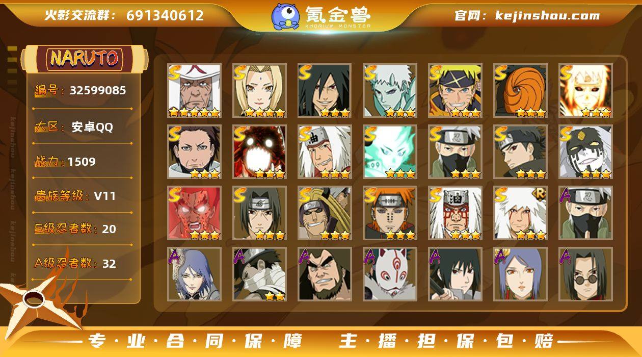 【火影忍者】战斗力:1509W+;段位:暗部1阶;本服排名:17;VIP:V11级;S忍:20个;A忍:32个;通灵兽:23个,S忍:十尾人柱力宇智波带土|须佐能乎旗木卡卡西|九喇嘛连结波风水门|五影会谈宇智波斑|天道佩恩|传说中的三忍自来也|漩涡鸣人宇智波佐助|须佐能乎宇智波止水|最终章大筒木舍人|仙人模式自来也|舞之豪杰自来也|纲手(普通) * 4星|神驹佑将宇智波斑|须佐能乎宇智波鼬|秽土转生金角银角|死门迈特凯|大筒木桃式|猿飞日斩(普通) * 5星|暴怒第六尾漩涡鸣人|初代目风影烈斗__A忍:青春爆炸迈特凯|仙人模式巳月|忍界大战李洛克|秽土转生角都|忍者之路神秘面具男|秽土转生迪达拉|近松十人卫千代|须佐能乎宇智波佐助|新春限定小南|忍界大战秋道丁次|忍界大战我爱罗|秽土转生猿飞阿斯玛|新春限定宇智波鼬|死司凭血飞段|疾风传我爱罗|迪达拉(普通)|飞段(普通)|神驹佑将小南|神威对决旗木卡卡西|迈特凯(普通) * 5星|宇智波鼬(普通)|干柿鬼鲛(普通) * 5星|秽土转生桃地再不斩|蝎(普通) * 3星|绯流琥蝎|猿飞阿斯玛(普通) * 5星|桃式显现漩涡博人|宇智波泉奈|羁绊神农|忍界大战土台|初始形态机械鸣人|侠隐江湖大野木__通灵兽:忍犬(普通)|蓝蛇|蛤蟆吉|忍龟|砂之守...